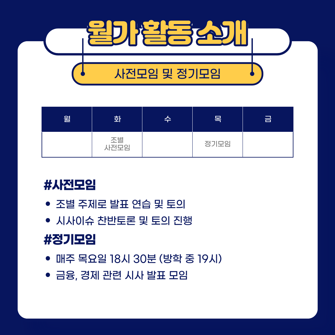 매주 화요일, 목요일 18시 30분 (방학 중에는 19시)에 이루어지는 사전모임, 정기모임에서는 금융, 경제관련 시사내용, 기업분석 발표로 모임을 진행합니다.