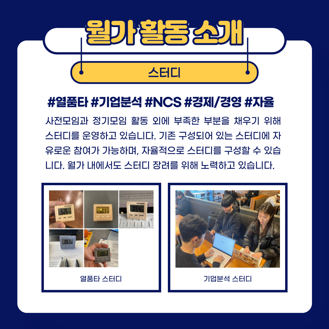 2) 경영·경제 스터디 – 경제, 경영, 통계 등 기업에서 실시하는 필기시험에 대비하여 스터디를 형성 후 진행합니다.