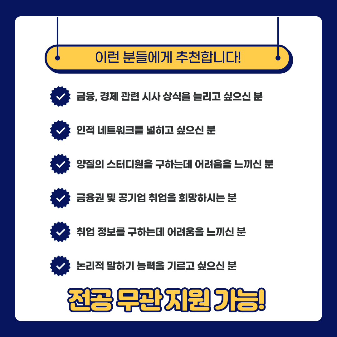 1) 금융권, 공기업, 사기업 취업을 희망하는 2학년 이상의 학생 (전공 무관, 남성의 경우 군필 또는 병역 의무가 없는 학생)