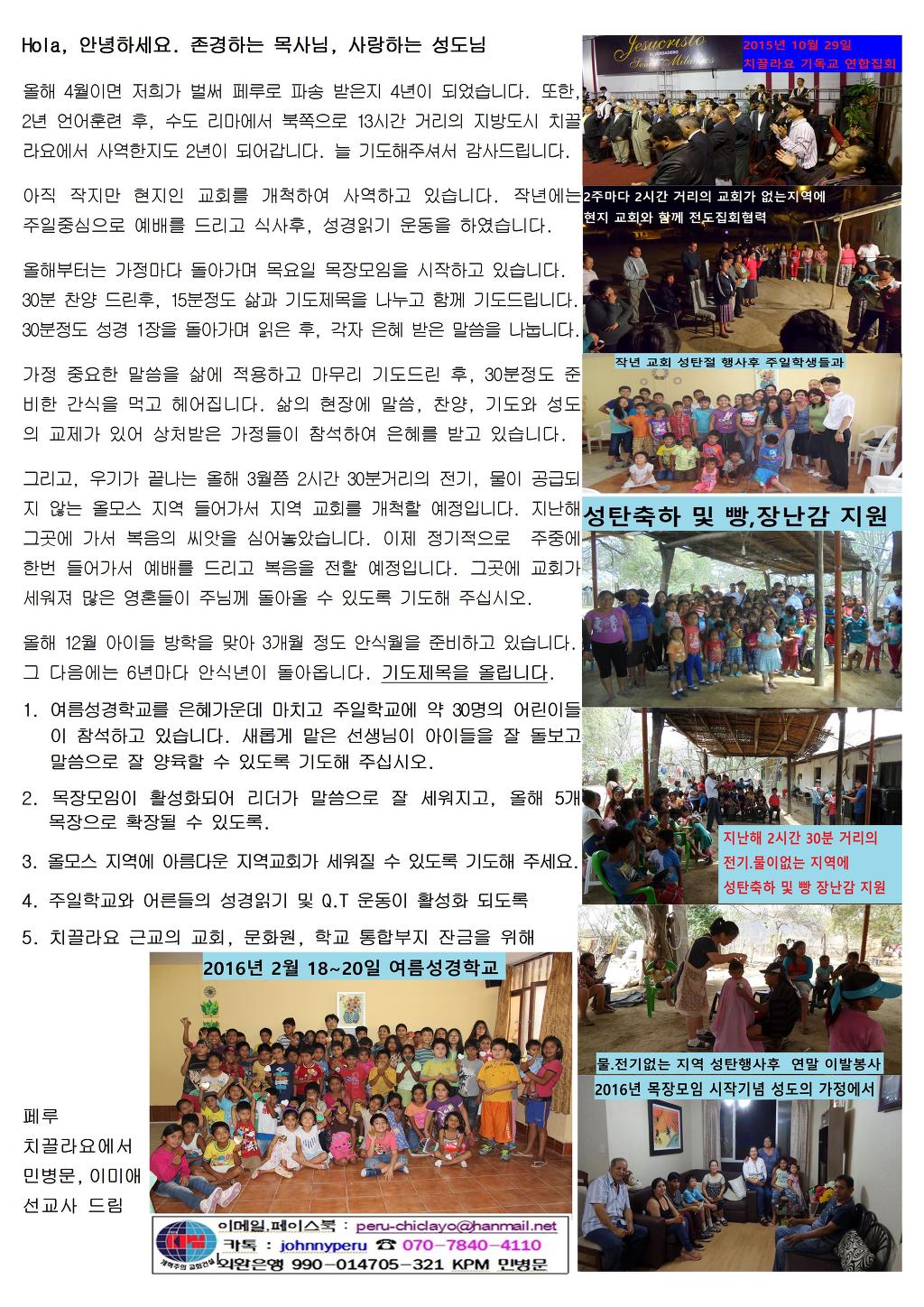 2016년 2월 말 -페루 치끌라요 민병문 이미애 선교사 기도편지 올립니다. 작성자자니|작성시간16.03.02|조회수83 목록 댓글 0 글자크기 작게가 글자크기 크게가 다음검색 현재 게시글 추가 기능 열기 북마크 공유하기 신고 센터로 신고 댓글 댓글 0 댓글쓰기 답글쓰기 댓글 리스트