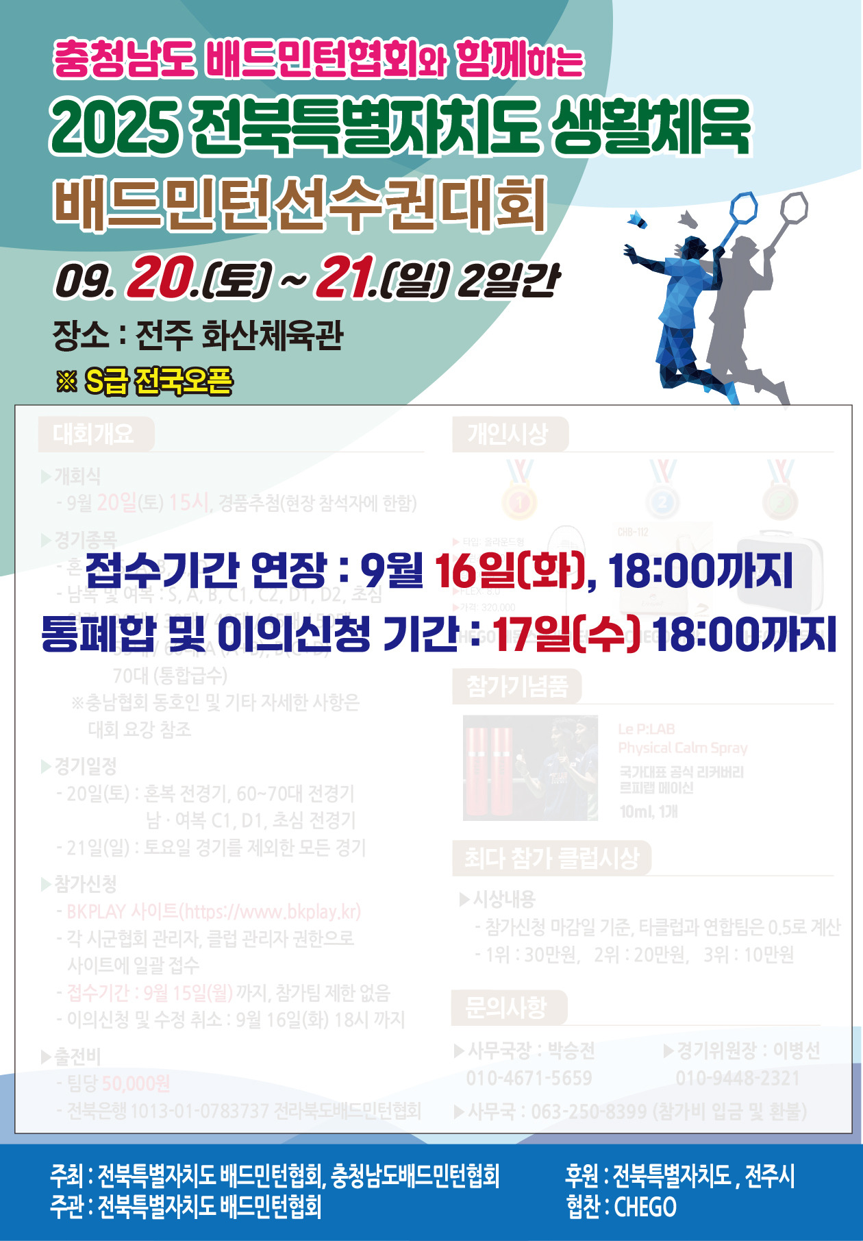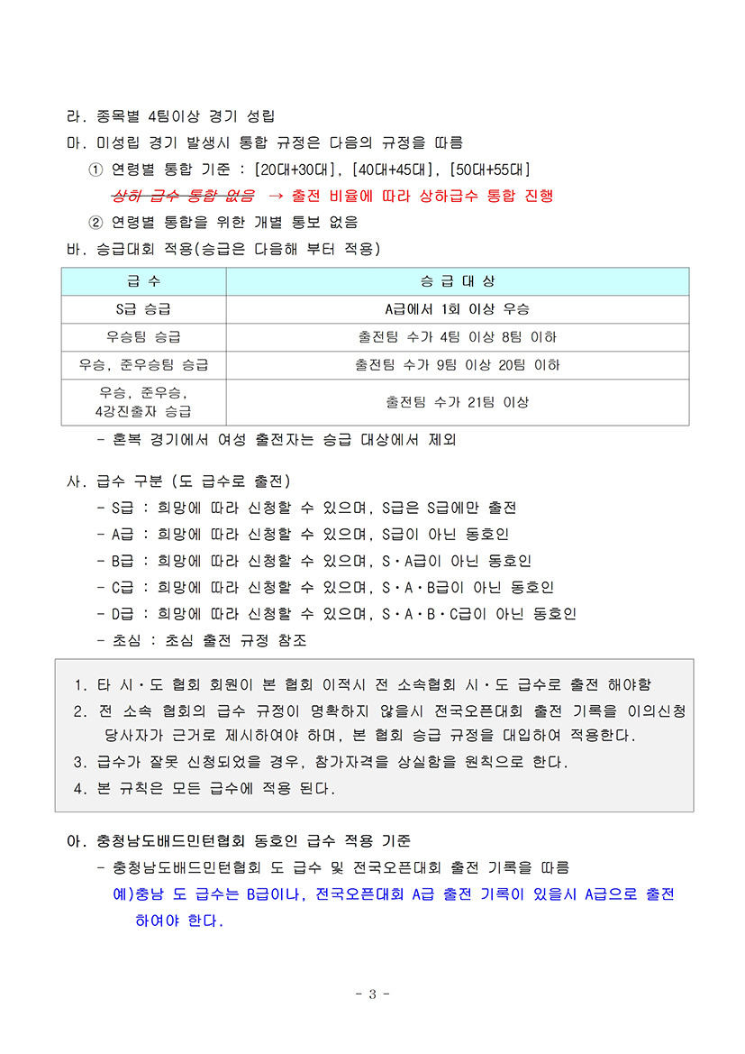 2025 충남협회와 함께하는 전북특별자치도 생활체육 배드민턴선수권대회 접수기간 연장 및 요강 일부 변경 안내 작성자사무국3|작성시간25.09.15|조회수295 목록 댓글 0 글자크기 작게가 글자크기 크게가 생활체육선수권대회 요강 일부 변경 안내 기존, 상하급수 통합 없음 변경, 출전 비율에 따라 상하급수 통합 진행 다음검색 현재 게시글 추가 기능 열기 북마크 공유하기 신고 센터로 신고 댓글 댓글 0 댓글쓰기 답글쓰기 댓글 리스트