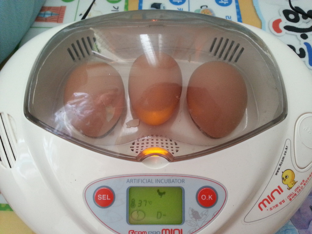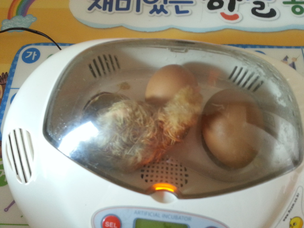 여름 방학을 맞은 아이들에게 기억에 남는 추억을 만들어 주고 싶어, 상의한 끝에 생명의 소중함과 방학기간동안 부화시킬수 있는 병아리로 결정을 하였다. 먼저 부화기를 구입하고 유정란을 마트에서 구입하였다. 이때 부화기를 구입하지 않고 스치로품에 전구를 달아 부화기를 만드는 방법도 있다. 우린 첫 시도여서 부화기를 구입하여 유정란 3알을 부화기로 넣고, 습도를 맞추기 위해 미지근한물을 물 투입구에 넣어 닭 21일로 설정하였다. 그후부터 부화기는 온도 37도에 실내 습도를 유지해주면서 한시간에 한번씩 전란을 시켜준다. 유정란하면 구하기 힘들다고 생각하는데 마트에서 파는 계란 코너에서 유정란을 손쉽게 구입할수 있고, 태어난지 얼마 안 된 것으로 구입을 하는게 좋으며 최대한 일주일을 넘기지 않아야 부화율이 높아진다.