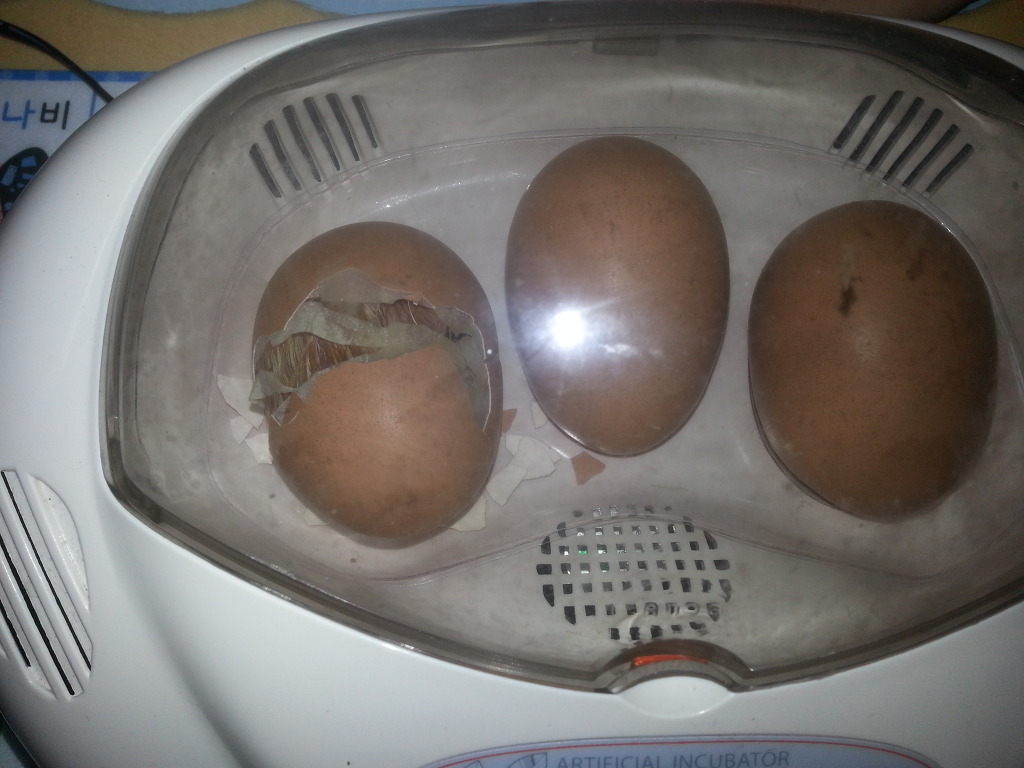 7월 19일 오후 5시에 부화기에 들어간 알들이 8월 10일에 새벽 5시에 발생(병아리가 부리로 깨고 나오는것)을 시작 했다. 평균 21일이 걸리는 병아리가 21일이 지나도록 아무런 반응이 없어서 걱정이 되던 찰나여서 작은 계란 껍질이 떨어진것 만으로도 살아 있었구나라는 안도감과 기쁨이 교차했다. 작은 막 사이로 삐악삐악 병아리 소리와 부리가 살짝 보인다.