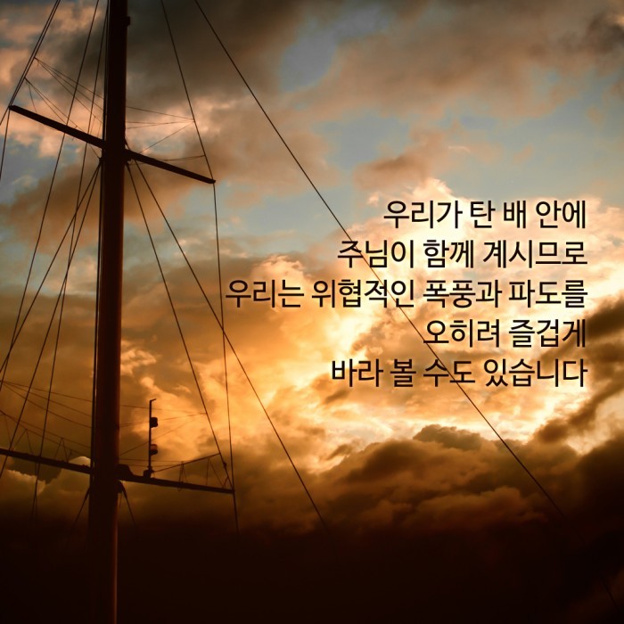 우리가 탄 배 안에 주님이 함께 계시므로 우리는 위협적인 폭풍과 파도를 오히려 즐겁게 바라 볼 수도 있습니다. 절대로 파선되지 않을 약속과 함께 바람과 파도를 타며 변하지 않는 곡조로 찬양을 불러 봅니다.