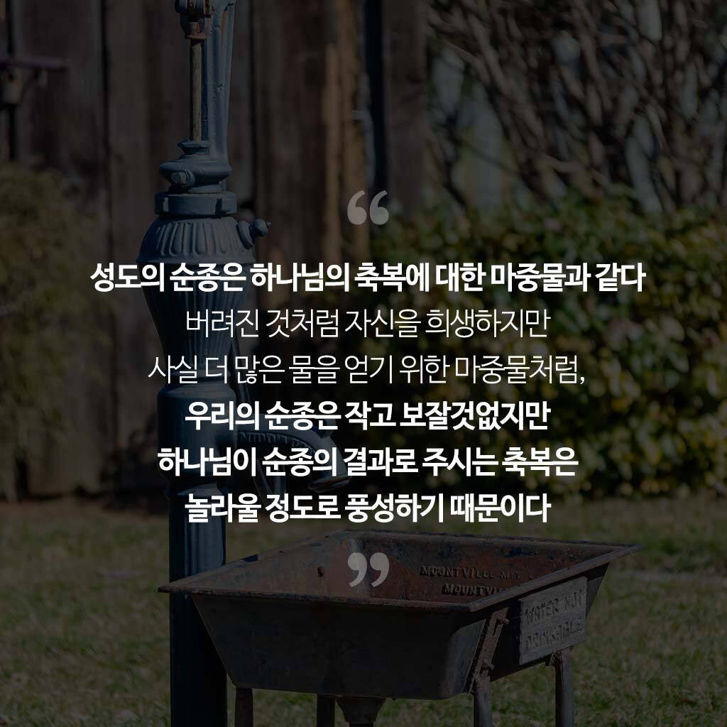 성도의 순종은 하나님의 축복에 대한 마중물과 같다. 버려진 것처럼 자신을 희생하지만 사실 더 많은 물을 얻기 위한 마중물처럼, 우리의 순종은 작고 보잘것없지만 하나님이 순종의 결과로 주시는 축복은 놀라울 정도로 풍성하기 때문이다.