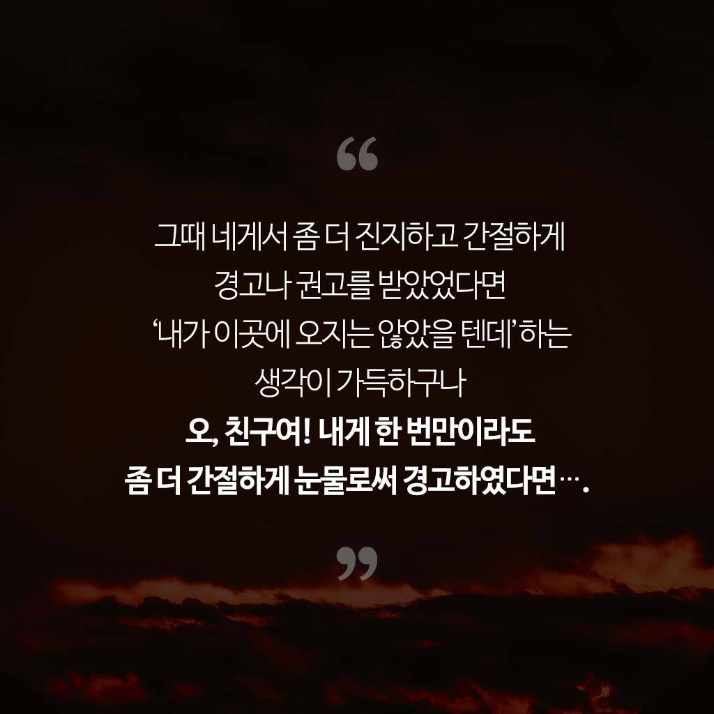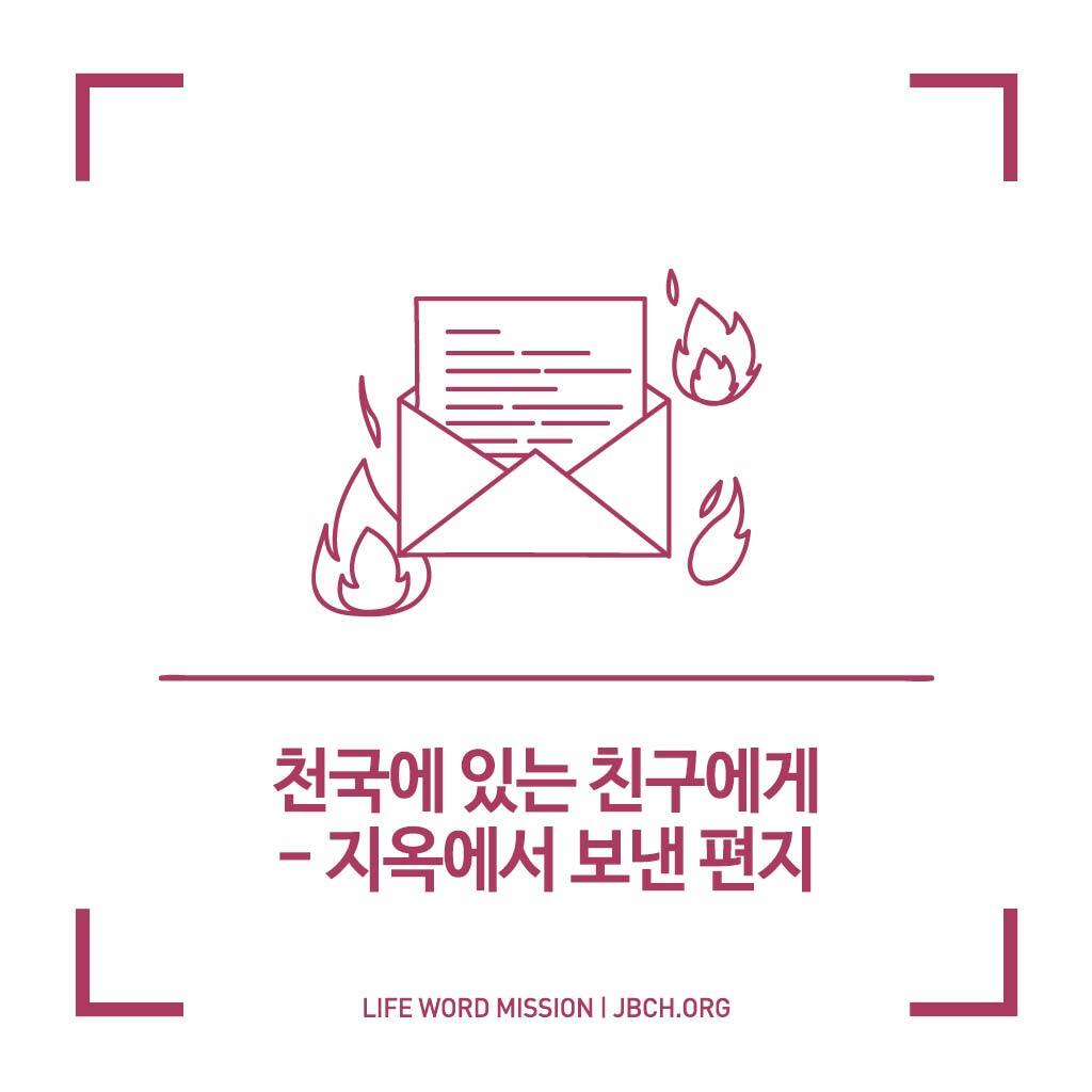 언젠가 네가 내게 선물로 준 전도집회 테이프를 본 기억도 떠오른다. 그때 테이프를 보기가 무척 지루했고 몇 개월에 걸쳐 조금씩 보았다. 그것이 얼마나 심각하고 중요한 시간이었는지 여기 와서 비로소 알게 되었다. 그때 내가 조금만 신경을 썼더라면 성경이 사실이라는 것과 내가 얼마나 비참한 죄인이었는지를 알게 되어 구원받을 수도 있었을 것이라고 생각을 하니…. 오, 자네는 내가 얼마나 큰 후회 속에 울고 있는지 아는가? 그때 네가 좀 더 성의를 갖고 적극적으로 권하였다면…. 최소한 그 테이프를 같이 봐주는 성의라도 베풀었다면 내가 좀 더 진지하게 그 테이프를 다 볼 수 있었을 것이라는 생각도 가져본다.