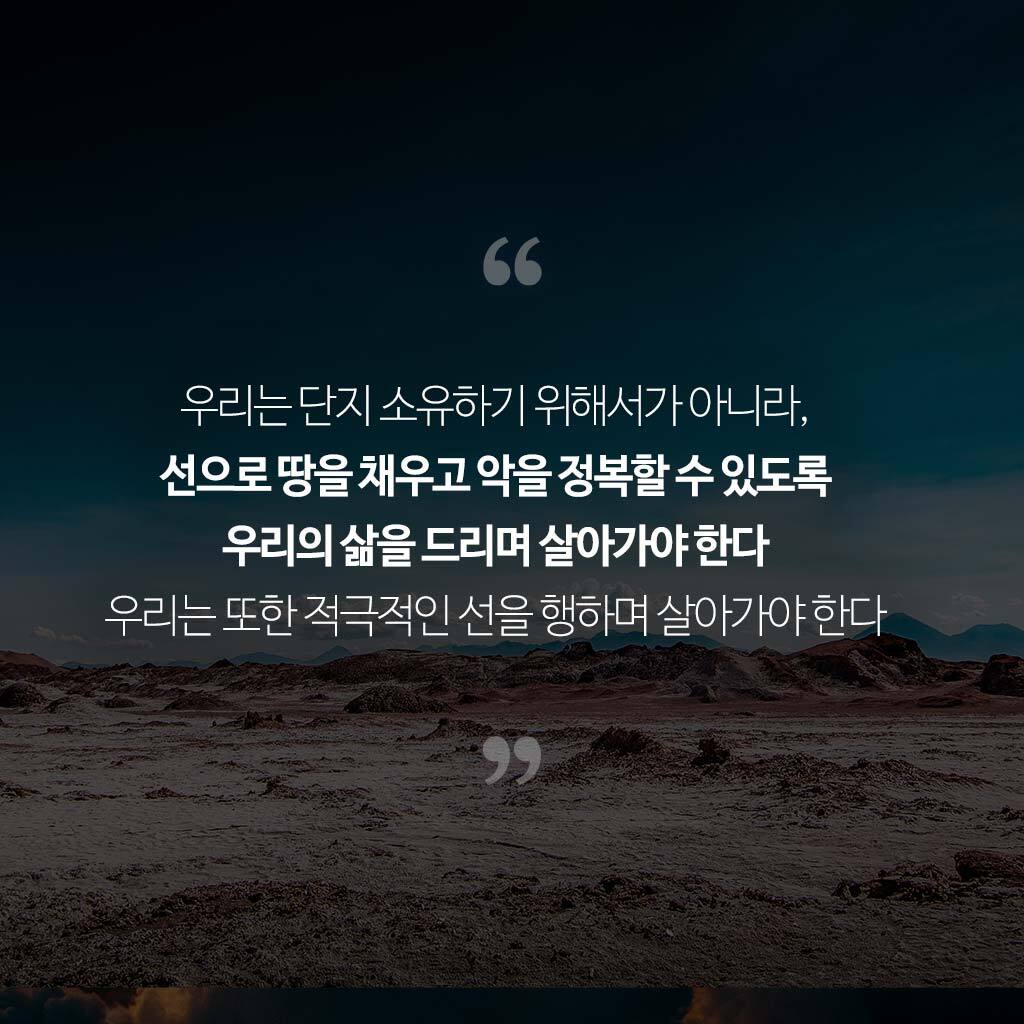 우리는 단지 소유하기 위해서가 아니라, 선으로 땅을 채우고 악을 정복할 수 있도록 우리의 삶을 드리며 살아가야 한다. 우리는 또한 적극적인 선을 행하며 살아가야 한다. 단지 소극적으로 범죄 하지 않는 상태를 지속하는 것이 삶의 목표가 아니다.