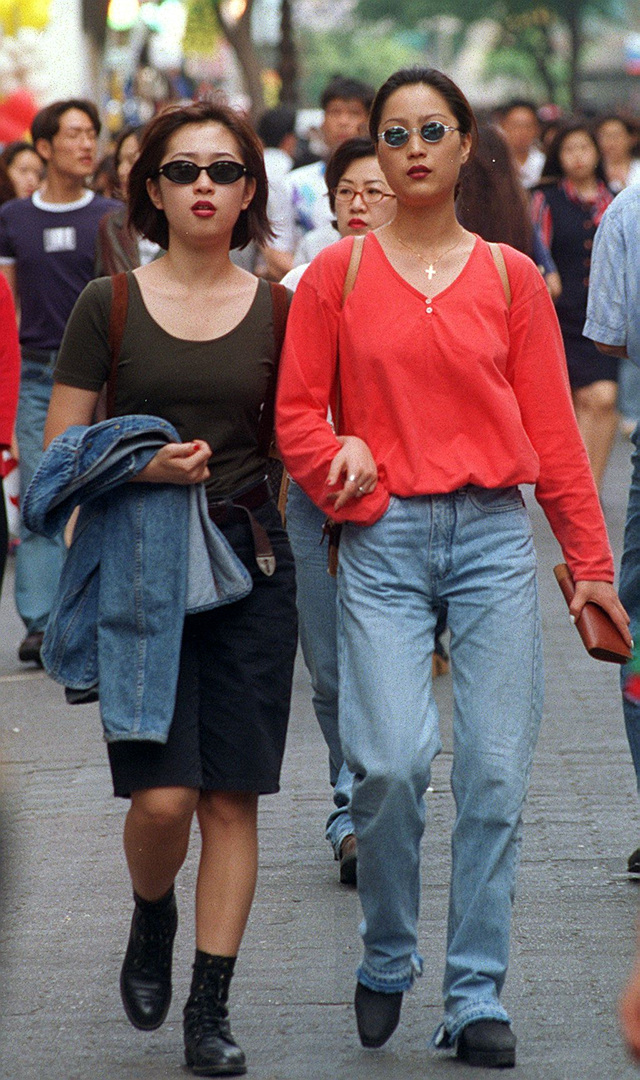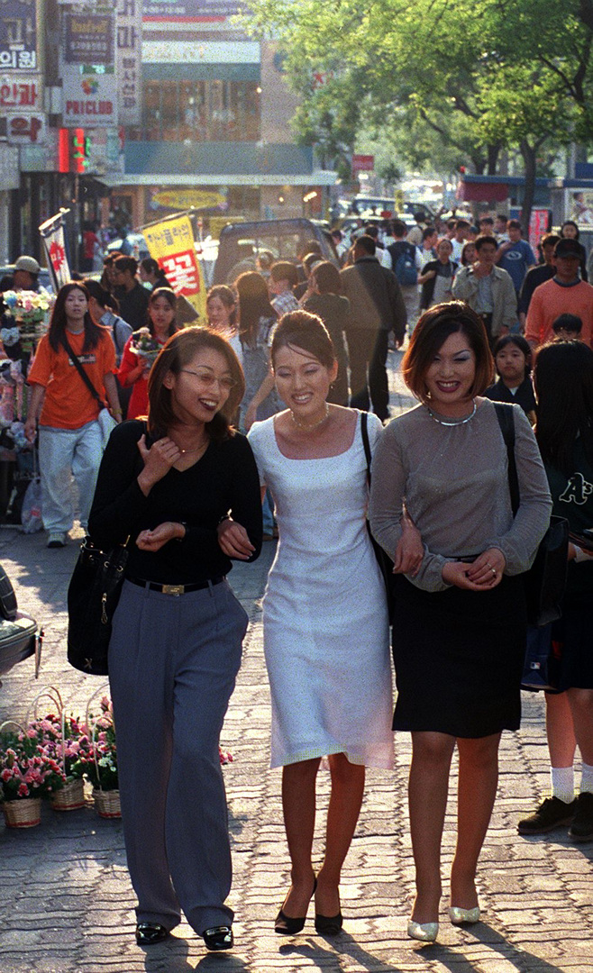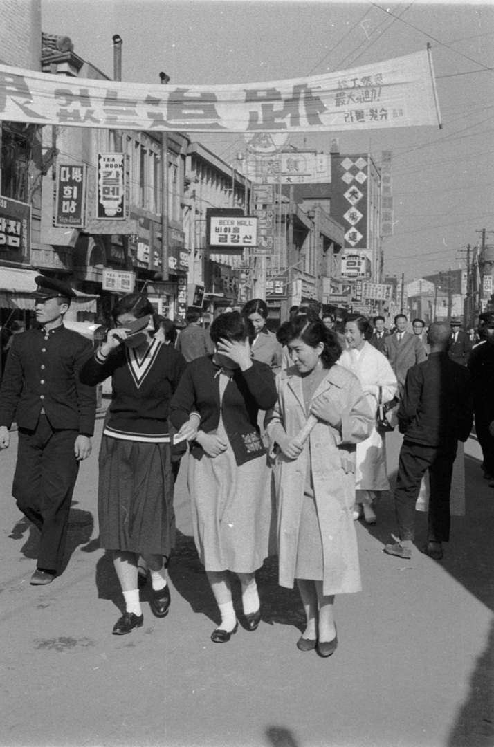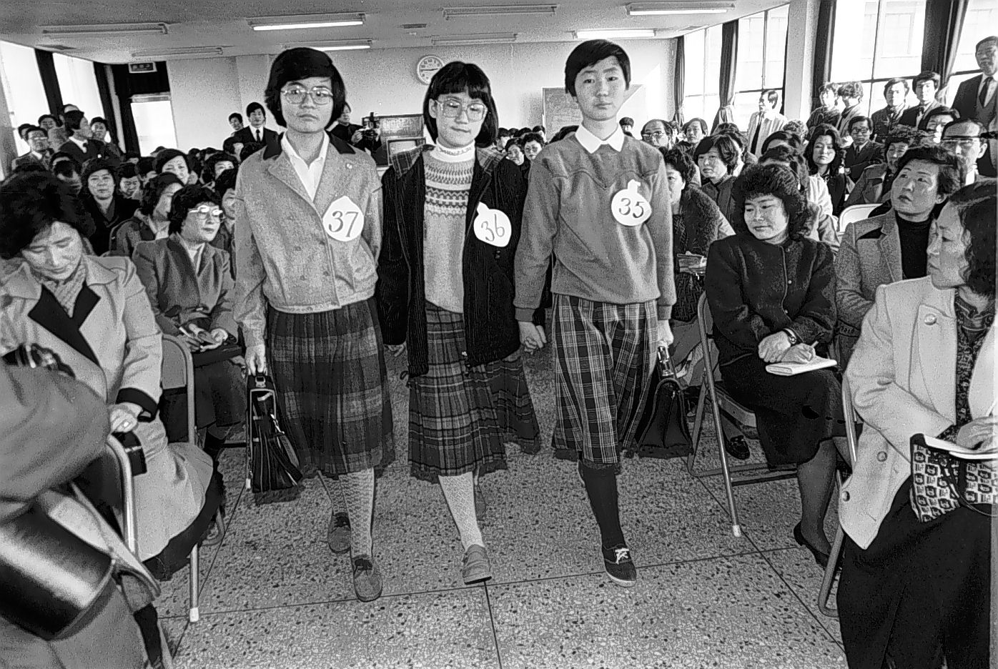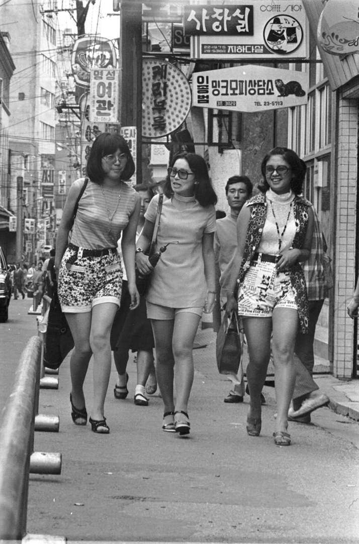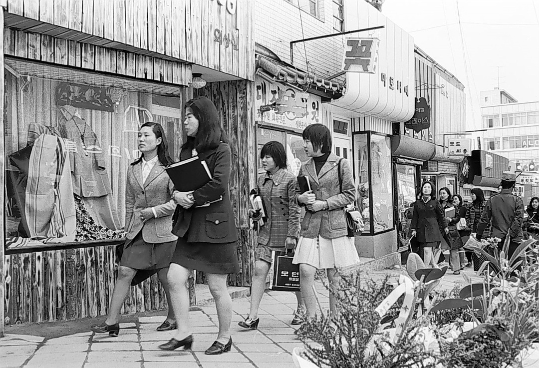 1969년 흰 블라우스와 검정스커트 차림으로 등교하는 이화여대생들.