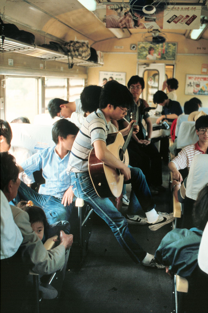 1985년 강촌 유원지로 가는 경춘선 열차안에서 통기타로 노래를 부르며 흥을 돋우고 있다. 당시 유행하는 패션으로 멋을 낸 젊은이들.