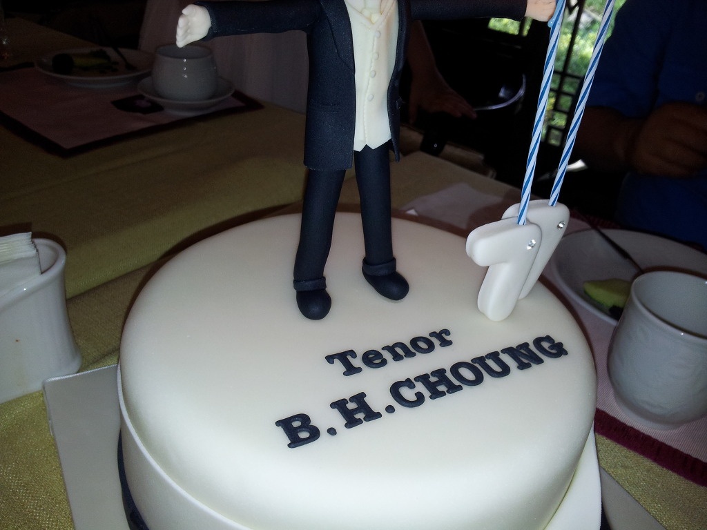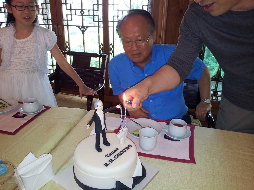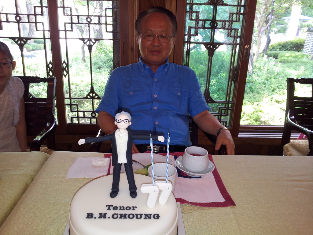 또한 祝賀 케익에 77이란 숫자와 Tenor B.H.CHOUNG을 상징하는 노래하는 인형까지 세웠으니 얼마나 흐뭇하십니까?이 자리를 마련한 아드님,며느리,따님,사위님 수고 많이 하셨습니다.그리고 친 손녀 딸아 할아버지 77세 생신에