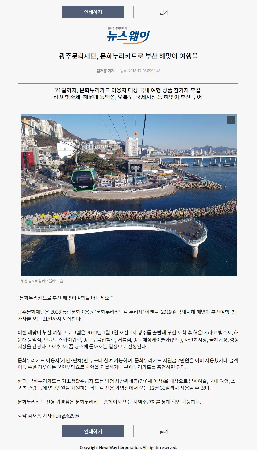 광주문화재단,문화누리카드로 부산 해맞이 여행을(12월6일/뉴스웨이) 작성자전북문화관광재단 문화관광팀|작성시간18.12.31|조회수90 목록 댓글 0 글자크기 작게가 글자크기 크게가 다음검색 현재 게시글 추가 기능 열기 북마크 공유하기 신고 센터로 신고 댓글 댓글 0 댓글쓰기 답글쓰기 댓글 리스트