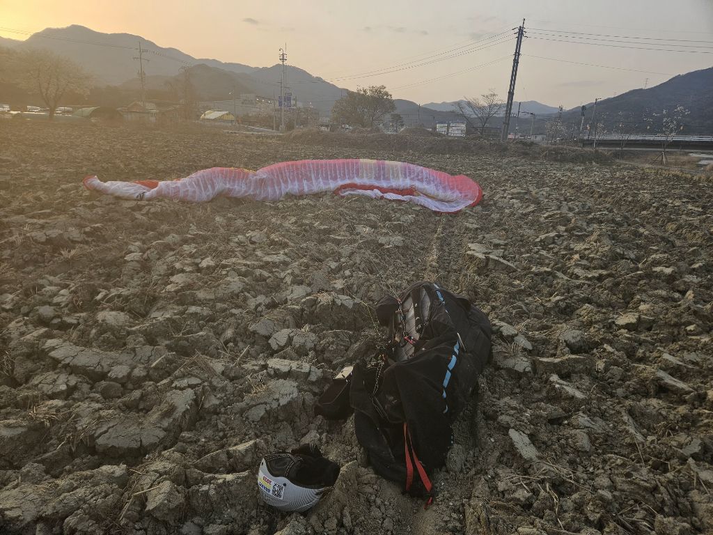 넘어 계속해서 이름 모를 첩첩산중을 넘으며 써멀을 잡는다. 오후 6시경이 가까워지자 슬슬 석양 빛이 들기 시작하여 착륙지를 물색 성주군 가천면 가천대교 옆에 착륙이다(첨에는 거창근처에 착륙한것으로 착각을).