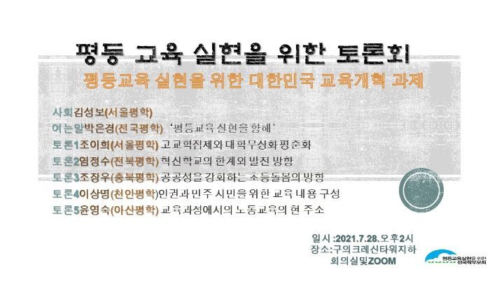 ※ 발제 내용 : 고교학점제 문제점과 대학평준화, 혁신교육 평가, 민주시민 교육 전망, 돌봄의 공공성 강화 방안, 노동교육 제안