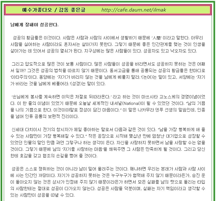 [스크랩] 남에게 잘해야 성공한다. 작성자천상의 연주자|작성시간12.10.10|조회수46 목록 댓글 0 글자크기 작게가 글자크기 크게가 예수가좋다오 다음검색 스크랩 원문 : ╋예수가좋다오 현재 게시글 추가 기능 열기 북마크 공유하기 신고 센터로 신고 댓글 댓글 0 댓글쓰기 답글쓰기 댓글 리스트