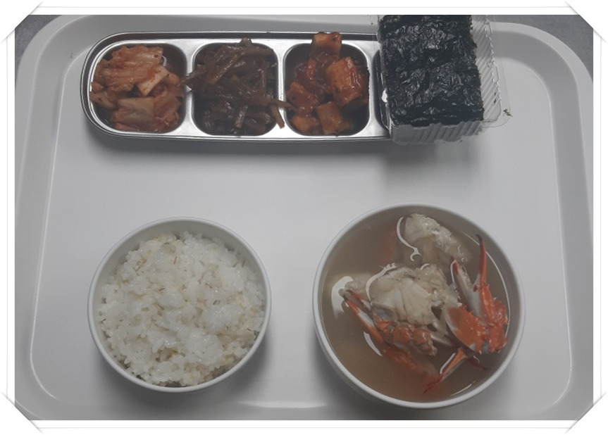 흰밥, 맑은꽃게탕, 배추김치, 우엉채조림, 두부강정, 김구이