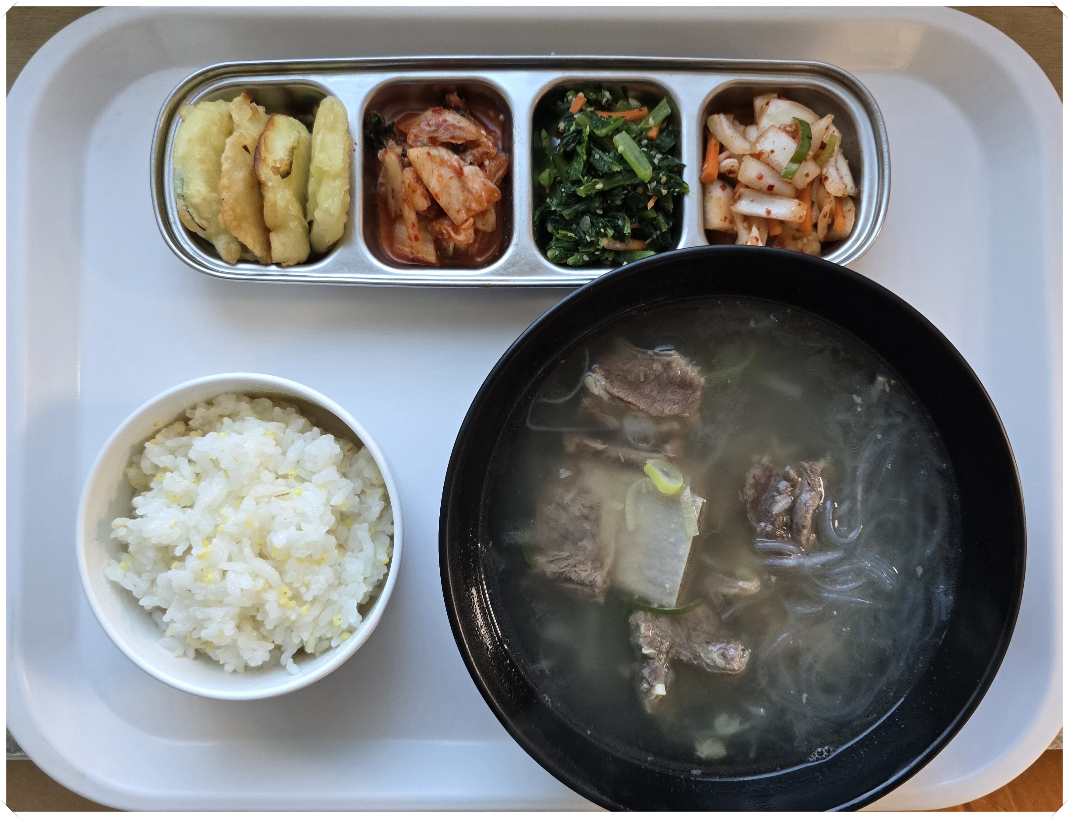 잡곡밥, 갈비탕, 감자전, 배추김치, 열무나물, 양파겉절이