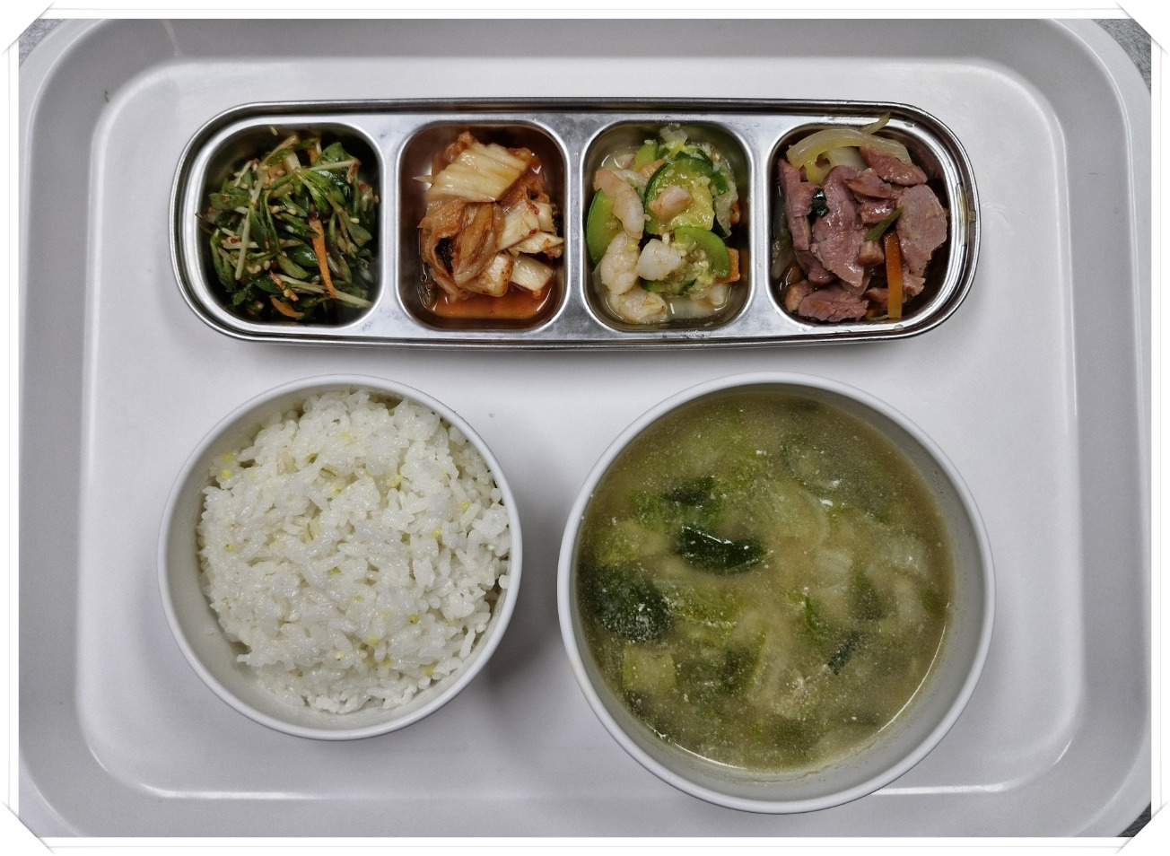 잡곡밥, 배추들깨국, 돌나물무침, 배추김치, 새우살호박볶음, 오리훈제불고기