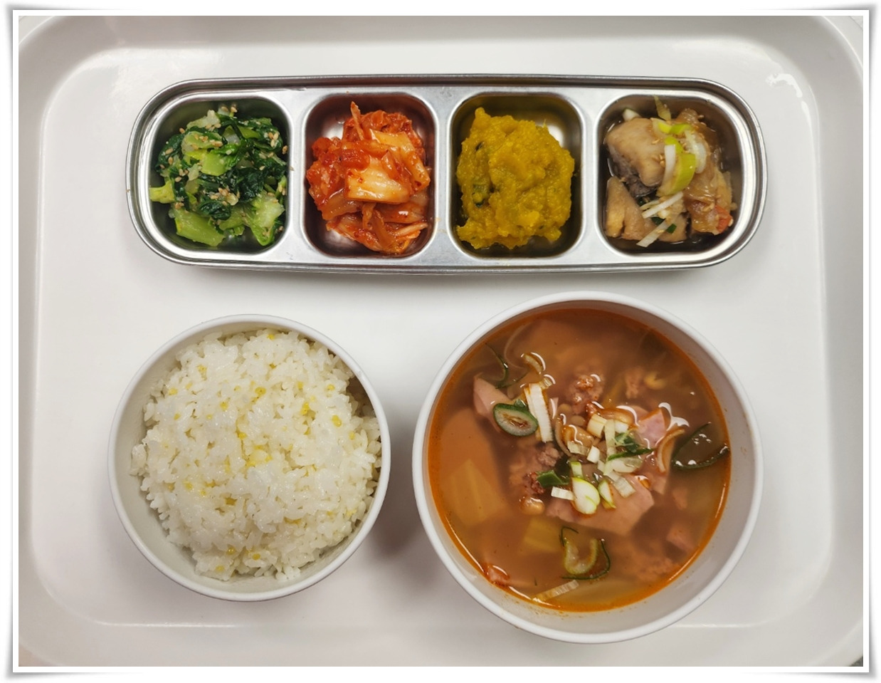 잡곡밥, 부대찌개, 청경채나물, 배추김치, 단호박범벅, 삼치엿장조림