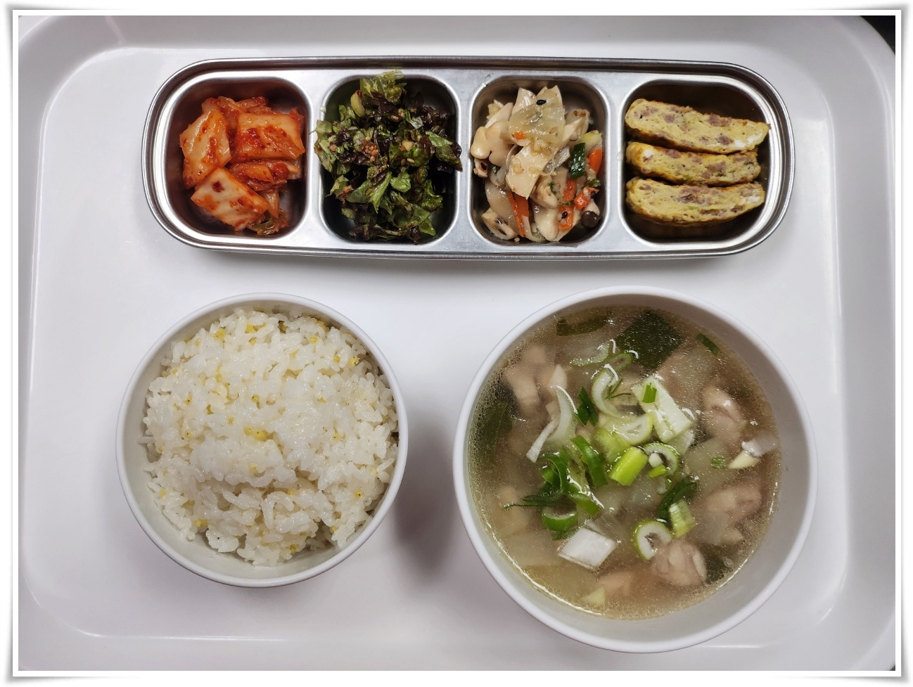 잡곡밥, 닭곰탕, 배추김치, 상추무침, 미니새송이버섯조림, 다진고기달걀말이