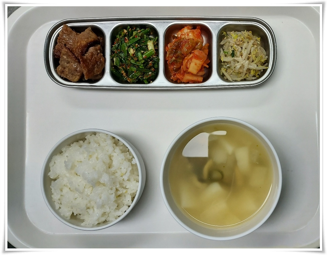 흰밥, 홍합살감자국, 너비아니구이, 파채무침, 배추김치, 숙주나물