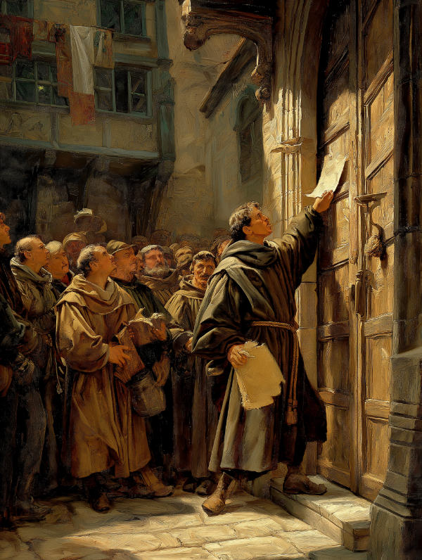 이 사건 이후 약 7년 후인 1517년 10월 31일 루터는 독일 비텐베르크 교회 정문에 95개 조의 반박문을 붙인 사건부터였다. 루터는 성경의 권위와 하나님의 은혜를 강조함으로써 부패한 교회를 개혁하고자 하였다. 루터가 내건 개혁의 강령은 ‘솔라 스크립투라(Sola Scriptura, 오직 성경), 솔라 그라치아(Sola Gratia, 오직 은혜), 솔라 피데(Sola Fide, 오직 믿음)’의 세 가지였다. 이 라틴 말들의 의미는 진리를 판단하는 최종 권위는 교회가 아니라 ‘성경’이며, 구원은 인간의 행위가 아니라 하나님의 ‘은혜’에 근거한 것으로 ‘믿음’을 통해서만 구원받을 수 있다는 것이다. 그런데 왜 루터가 10월 31일에 이 일을 결행(決行) 했을까? 그 이유는 11월 1일은 ‘만성절(萬聖節, All Saints' Day)’이라고 불리는 모든 성자의 대축일이었기 때문이다. 이날은 성인으로 칭호를 받지 못하고 죽은 성도들도 함께 추모하는 날이었다. 만성절에 교회 지하에 있는 성인들의 유골을 개방하면 유골을 만지고 입을 맞추며 경배하였다. 이러한 행위가 연옥에 머물고 있는 죽은 조상의 영혼을 천국에 보낼 수 있다고 믿었다. 이 얼마나 미신적인 날인가? 루터는 이러한 만성절의 미신적인 행동을 없애기 위하여 10월 31일 종교개혁을 시작했다. 루터의 일생에 중요한 경험이 있었다. 1505년 7월, 벼락의 경험을 통해 부르심을 받았고, 약 10년 후, 기도탑의 경험을 통해 칭의를 깨닫게 되었다. 사람이 죄 용서함을 받는 것은 돈이나 선행으로 되는 것이 아니라 오직 하나님이 준비해 놓으시고, 우리에게 입혀주시는 예수 그리스도의 의의 옷을 입음으로 가능하다는 것을 알게 되었다. 루터는 교황에게 죄를 사하는 권세가 없고, 돈을 받고 면죄부를 줌으로 내세의 문제에 관여할 권한이 없다는 것을 확실히 알게 되었다. 그래서 루터는 만성절 전야, 10월 31일에 95개 조항의 반박문을 적어 비텐베르크 교회 정문에 박아 붙여놓았다.