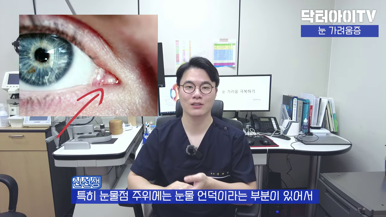 특히 눈물점 주위에는 '눈물 언덕'이라고 하는 부분이 있어요. 그래서 구조상으로도 이런 노폐물들이 잘 걸리게 되고, 이런 것들과 눈 속의 점액 성분들이 뒤엉켜서 눈곱 형태로 뭉쳐 눈 안쪽을 물리적으로 자극하다 보니까 가려움을 잘 느끼게 되는 겁니다.