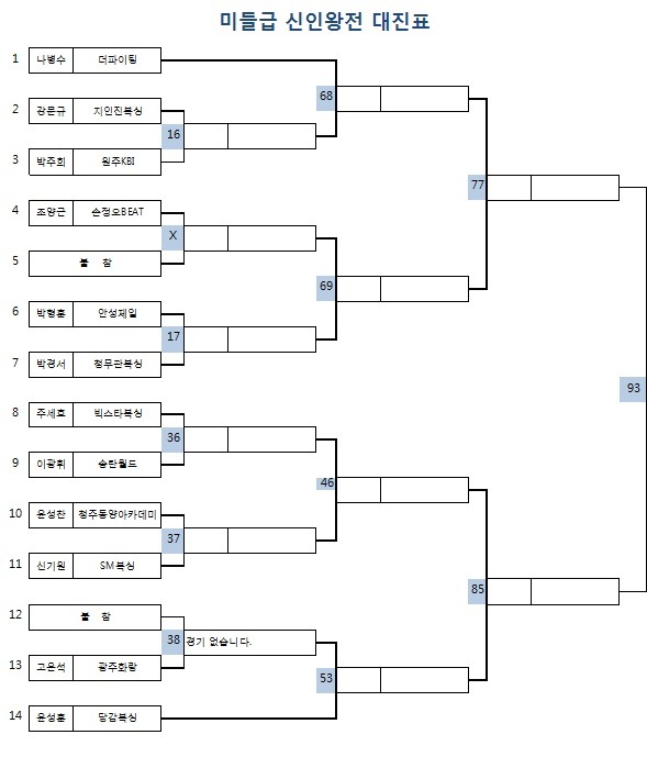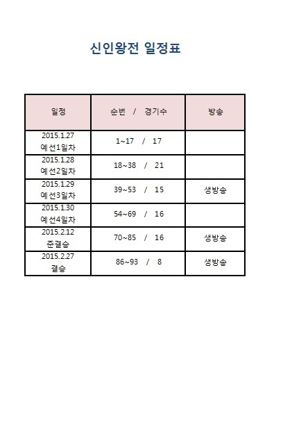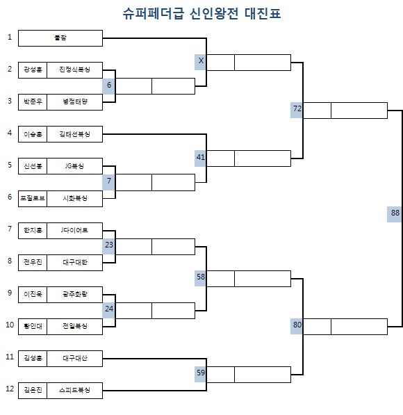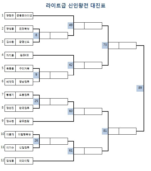 | 1. 대 회 명 : KBF 2014년도 전국 신인왕전 2. 경기장소 : IYF광주문화체육센터 (광주광역시 광산구 신촌동 869-1 / 070-7538-5209) 3. 대회일정 - 예선전 : 2015년 1월27일 ~ 30일 <04일>정오 12시 - 준결승 : 2015년 2월12일(목) 정오12시 - 결 승 : 2015년 2월 27일(금) 정오12시 ** 대진표별 시합 일정은 위 첨부된 대진표의 번호를 확인 바랍니다. 대진표별 번호순의 날짜별로 시합을 진행할 예정이니, 각 관장님들께서는 소속 체육관의 출전 선수 일정을 꼼꼼히 확인 바랍니다. 4.주관, 인정 : KBF 한국권투연맹 5.주최 : 풍산프로모션 6.방송 : MBC 지상파 생중계 방송 7. 시행체급 : 8체급 / 밴텀급, 페더급, 슈퍼페더급, 라이트급, 슈퍼라이트급, 웰터급, 슈퍼웰터급, 미들급 8. 경기방식 : 각 체급별 토너먼트 - 예선전 : 2분 4회전, 준결승 : 3분 4회전, 결승전 : 3분 6회전 9. 검진 및 계체량 일정 - 계체량 장소 : 광주광역시 광산구 보건소 (광주광역시 광산구 광산로 29번길 15 / 062-960-8734) - 계체량 일정 가. 1월 27일 시합선수(예선1일차) : 1월 26일(월) 정오 12시 검진 및 계체량 나. 1월 28일 시합선수(예선2일차) : 1월 27일(화) 오전 9시 검진 및 계체량 다. 1월 29일 시합선수(예선3일차) : 1월 28일(수) 오전 9시 검진 및 계체량 라. 1월 30일 시합선수(예선4일차) : 1월 29일(목) 오전 9시 검진 및 계체량 바. 2월 12일 시합선수(준결승전) : 2월 11일(수) 오전 9시 검진 및 계체량 사. 2월 27일 시합선수(결승전) : 2월 26일(목) 오전 9시 검진 및 계체량 ** 검진 및 계체량을 반드시 통과해야만 시합 출전이 가능하니 이점 차질없도록 참조 바랍니다. 예선1회전을 통과한 선수는 곧바로 다음날 계체량을 또다시 통과하고 시합에 출전 합니다. ** 예선전 및 준결승 결승 모든 시합 출전시 트렁크는 각 체육관별 자율 착용 바랍니다. (주최측 별도 미지급) 10. 대전료 및 포상계획 - 체급별 예선전 : 4회전 20만원 - 체급별 준결승전 : 4회전 40만원 - 체급별 결승전 : 6회전 100만원 ** 대전료 지급은 각 선수별 개인계좌로 입금될 예정이니, 각 관장님들께서는 계체량에 오실때 사전에 출전선수별 소속체육관명, 선수명, 계좌번호,주민등록번호, 핸드폰번호를 작성하여 계체량시 제출바 랍니다. - 대회 MVP : 1명, 300만원 - 대회 우수상 : 1명 100만원 - 체급별 우승자는 "신인왕 인정서"수여 / 우승,준우승자는 국내랭킹 10위권 진입 - 체급별 우승자는 의무적으로 년 4회 이상 시합 출전기회 부여함. ** 최초 계획했던 체급별 우승상금은 주최측의 사정으로 인하여 금번 대회에서는 부득이 지급을 하지 못하게 되었습니다. 이점 널리 양해 바랍니다. 내년도에는 더욱 알차고 풍성한 대회를 준비하도록 하겠습니다. 한국권투연맹 사무처. |