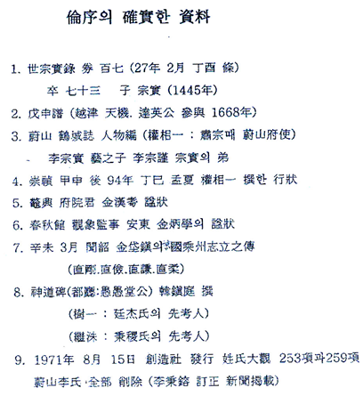 8 133쪽에서 1차 격쟁이 1832년 시작했는데 종실·종근은 1400년 경 출생하여 400년이상의 지난 1830년대에서 400년 전의 서열관계를 조정에서는 어떤 증빙을 가지고 어떻게 판결하였는지 의문이 들고, 구전으로 내려오는 이야기라든가 한성부장적이나 여러 가지를 판단하여 하였다면 그 당시 조정에 연이 있는 쪽에 유리하게 판결하였는지도 입증이 되지 않은 상태임