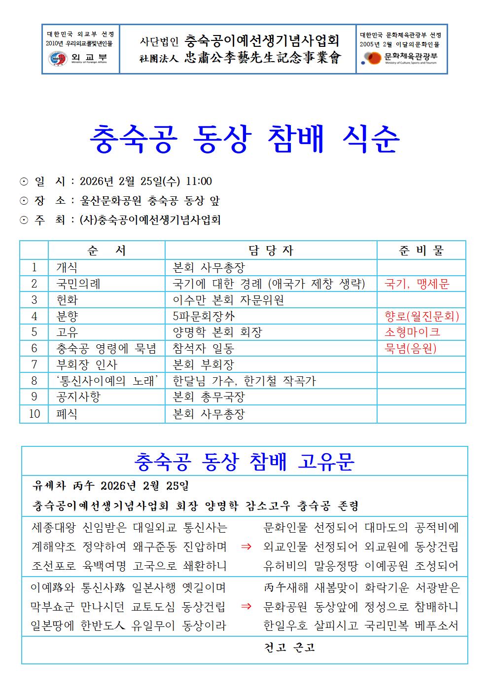 26.2.25 울산문화공원 이예동상 참배 행사 작성자이오걸|작성시간26.02.25|조회수19 목록 댓글 0 글자크기 작게가 글자크기 크게가 다음검색 현재 게시글 추가 기능 열기 북마크 공유하기 신고 센터로 신고 댓글 댓글 0 댓글쓰기 답글쓰기 댓글 리스트