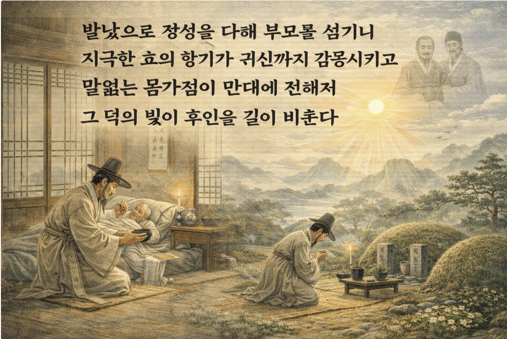 밤낮으로 정성을 다해 부모를 섬기니, 지극한 효의 향기가 귀신까지 감동시키고