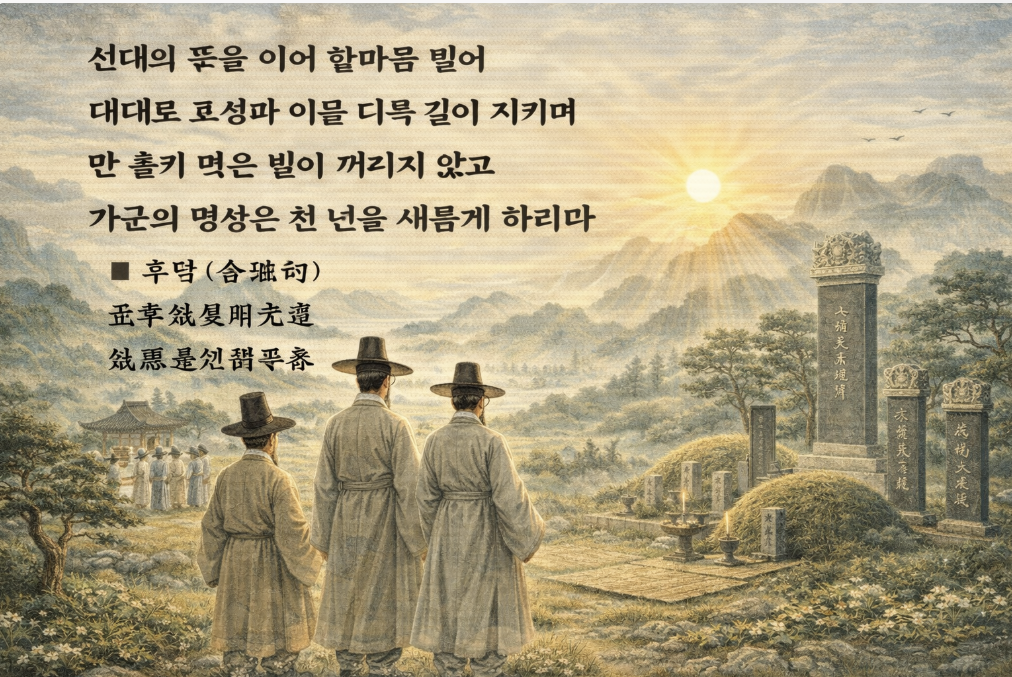 선대의 뜻을 이어 한마음 맺어, 대대로 효성과 의를 더욱 깊이 지키며