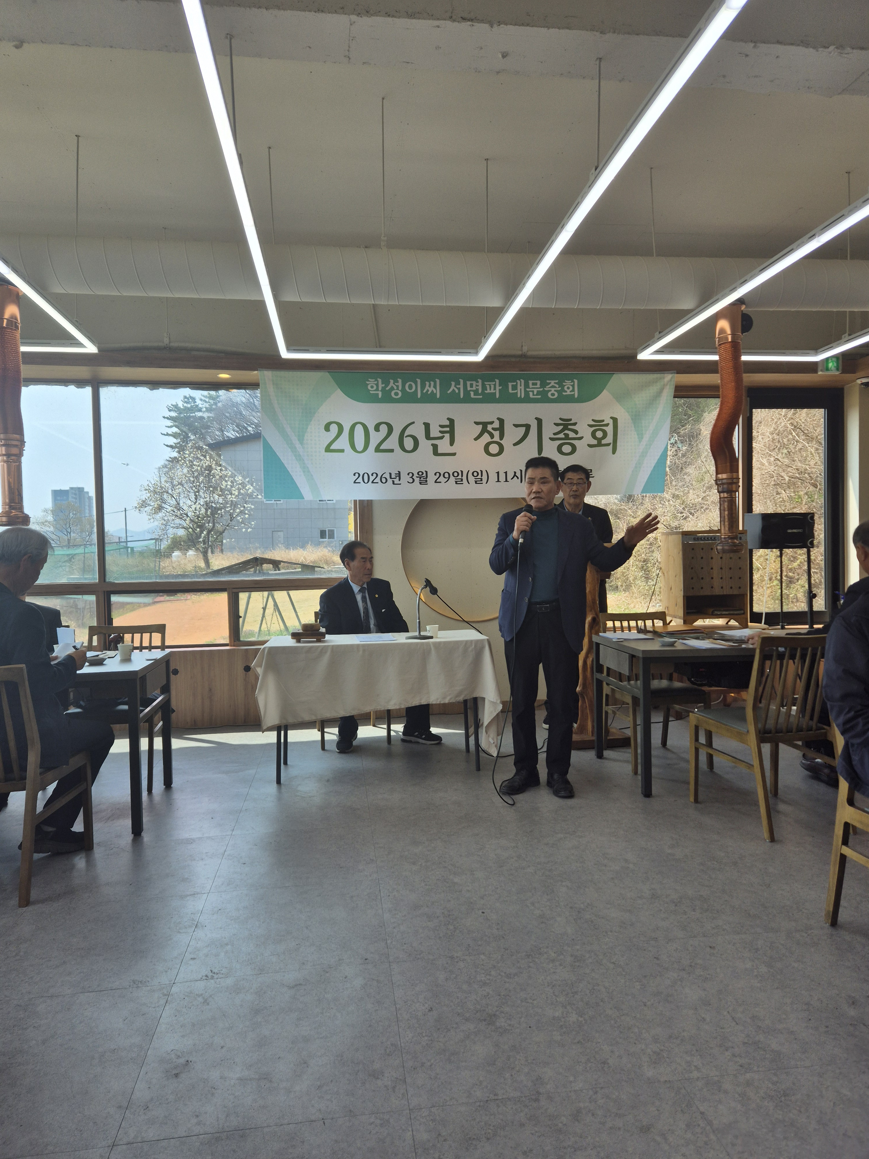 - 사무국장(창훈) 문원 40명 이상이 참석하여 성원이 되었음을 보고하고, 회장(백우) 학성이씨 서면파 대문중회 2026년 정기총회 개회를 선언함