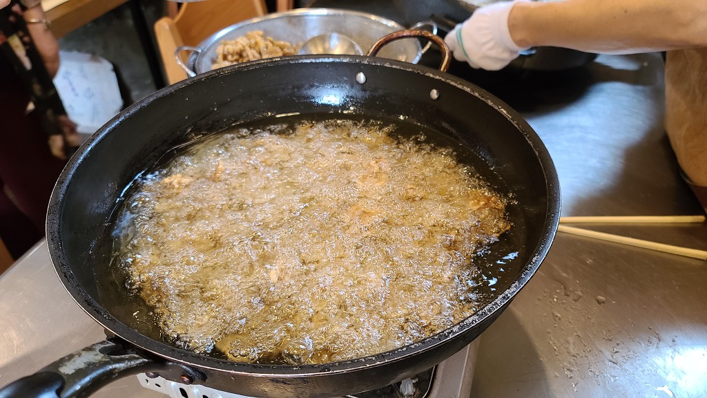 6. 120도의 튀김기름에 시럽 묻힌 호두를 넣고 색을 보며 저어가면서 10~13분 정도 튀겨낸 후 기름기를 쭉 뺀다.