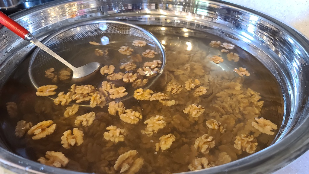 1. 호두를 팔팔 끓는 물에 7분 정도 삶아 체에 건진다.(이렇게 하면 호두의 떫은 맛과 쓴 맛이 빠진다.)