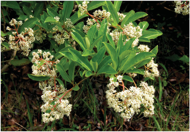 아왜나무는 중국, 일본, 타이완, 한국 등지에 분포하고 있어요. 제주도의 낮은 지대의 숲속에서 자라납니다. 아왜나무의 꽃은 6~7월에 가지 끝에 달리는데요. 자잘한 흰색 꽃이 모여 피고 가을에 붉게 익는 열매가 맺히기도 합니다. 생김새가 아름다워 조경수로 심기도 합니다. 붉은 열매가 달린 모습은 붉은 산호와 닮았다고 해서 중국에서는 산호수라고 부르기도 한답니다.