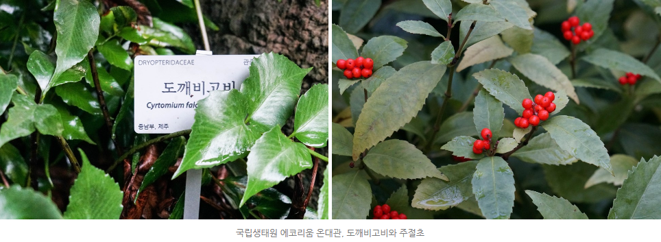 온대관에 마련된 제주도 난온대림 구역에서는 아왜나무 이외에도 도깨비고비, 속새, 죽절초(원본에 주철초라고 한것은 글쓴이의 오류인 듯 합니다.) 호랑가시나무 등을 만나볼 수 있습니다~