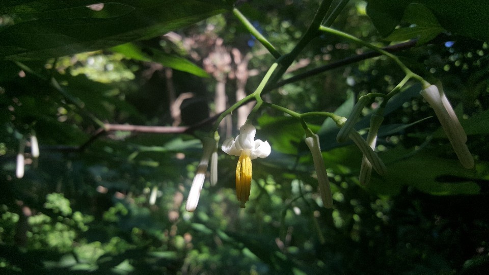 꽃 모양도 독특하여 손가락 두 마디 길이나 됨직한 가늘고 기다란 연노랑의 꽃잎이 도르르 말려 뒤로 젖혀지면서 속의 노랑 꽃술을 다소곳이 내밀고 있다. 잎사귀 위로 꽃이 솟아오르는 법이 없이 모두 아래를 향하여 핀다. 박쥐나무 꽃의 이런 모습은 타임머신을 타고 멀리 조선시대로 돌아가게 한다. 마치 층층시하에 조심조심 살아가던 가련한 여인이 얼굴을 가리고 잠깐 외출을 하려는 그 순간의 애잔한 모습을 보는 것 같다.