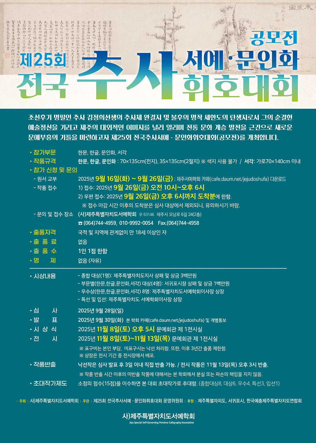 2025년 제25회 전국추사서예문인화휘호대회 포스터 및 원서 작성자제주서예학회|작성시간25.08.25|조회수392 목록 댓글 0 글자크기 작게가 글자크기 크게가 제25회 전국추사서예문인화휘호대회-출품원서.hwp38.00KB 첨부파일첨부된 파일이 2개 있습니다. jpg 파일 25회 추사 포스터.jpg 다운로드 hwp 파일 제25회 전국추사서예문인화휘호대회-출품원서.hwp 다운로드 다음검색 현재 게시글 추가 기능 열기 북마크 공유하기 신고 센터로 신고 댓글 댓글 0 댓글쓰기 답글쓰기 댓글 리스트