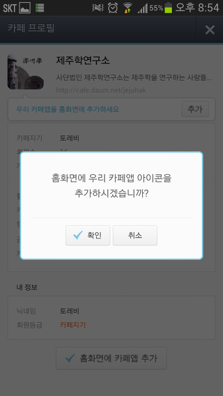 사실상 제주학연구소 카페앱을 등록한 것이라기보다 바로가기 아이콘을 하나 추가한 것인 셈입니다. 우리 카페에서 뒤로가기를 누르면 다음카페앱의 초기화면으로 이동합니다.