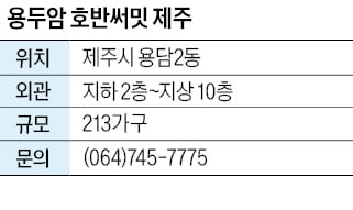 호반건설이 제주시 용담2동에서 ‘용두암 호반써밋 제주’를 분양 중이다. 지하 2층~지상 10층, 5개 동, 총 213가구(전용면적 84·113㎡) 규모다. 입주는 다음 달 예정이다.