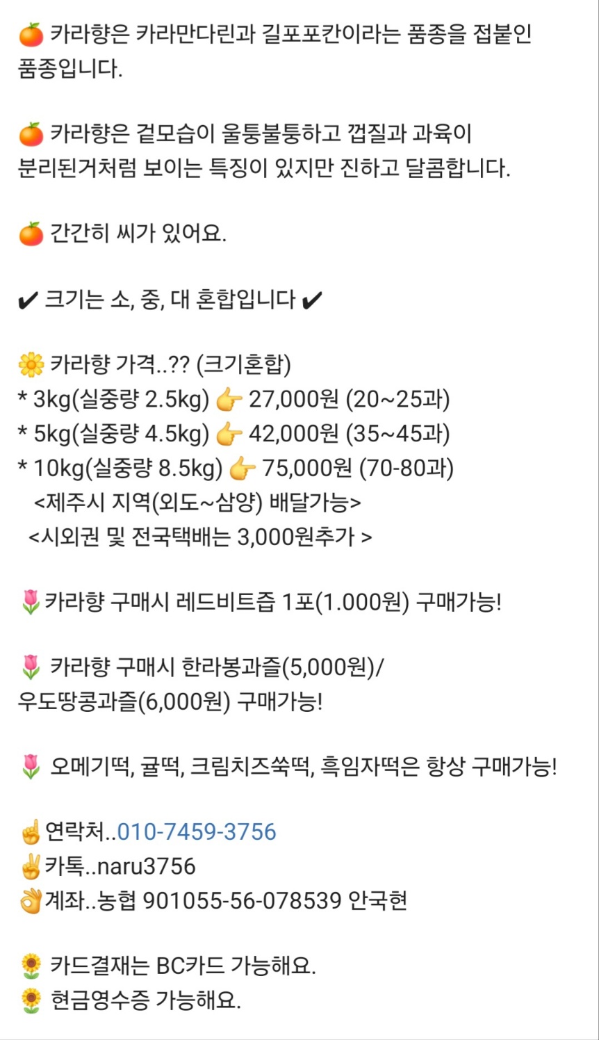 찐한달콤 환타맛 "카라향" 판매해요. 작성자제주신선닷컴|작성시간24.05.05|조회수48 목록 댓글 0 글자크기 작게가 글자크기 크게가 *주문전화 : 010-7459-3756*카톡아이디: naru3756*입금계좌 : 농협 901055-56-078539 안국현* 카라향 * 다음검색 현재 게시글 추가 기능 열기 북마크 공유하기 신고 센터로 신고 댓글 댓글 0 댓글쓰기 답글쓰기 댓글 리스트