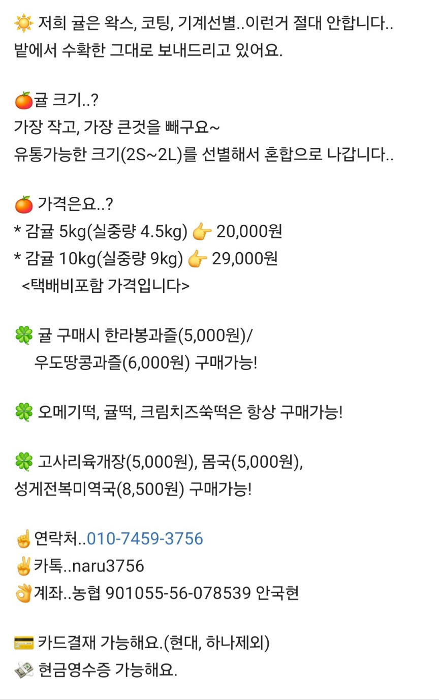 | *주문전화 : 010-7459-3756 *카톡아이디: naru3756 *입금계좌 : 농협 901055-56-078539 안국현 * 인스타그램: https://www.instagram.com/jejunaru/ * 제주 감귤 * |