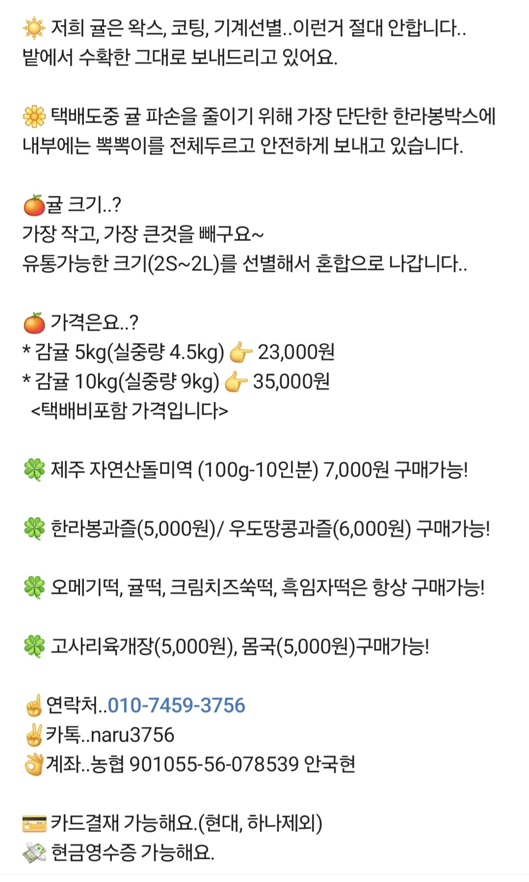 후기좋은 제주감귤 판매해요. 작성자제주신선닷컴|작성시간25.12.31|조회수24 목록 댓글 0 글자크기 작게가 글자크기 크게가 *주문전화 : 010-7459-3756*카톡아이디: naru3756*입금계좌 : 농협 901055-56-078539 안국현* 제주 감귤 * 다음검색 현재 게시글 추가 기능 열기 북마크 공유하기 신고 센터로 신고 댓글 댓글 0 댓글쓰기 답글쓰기 댓글 리스트