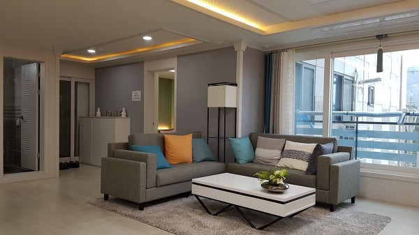 7. 화이트 인테리어와 우물천정이 설치된 거실