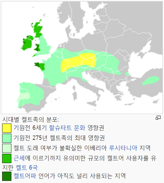 그들의 고국은 지금의 남독일 근처라고 전해지고 있다. 기원 전후에는 거의 프랑스 근처까지 영역을 넓혔다. 벨기에, 스위스, 이베리아 반도, 발칸 반도, 소아시아까지 영역을 넓혔던 시기도 있다. 그러나 그후, 여러 민족에게 억압을 받으면서 그들은 대륙을 떠나 영국이나 아일랜드 등의 섬에 숨어버렸다.