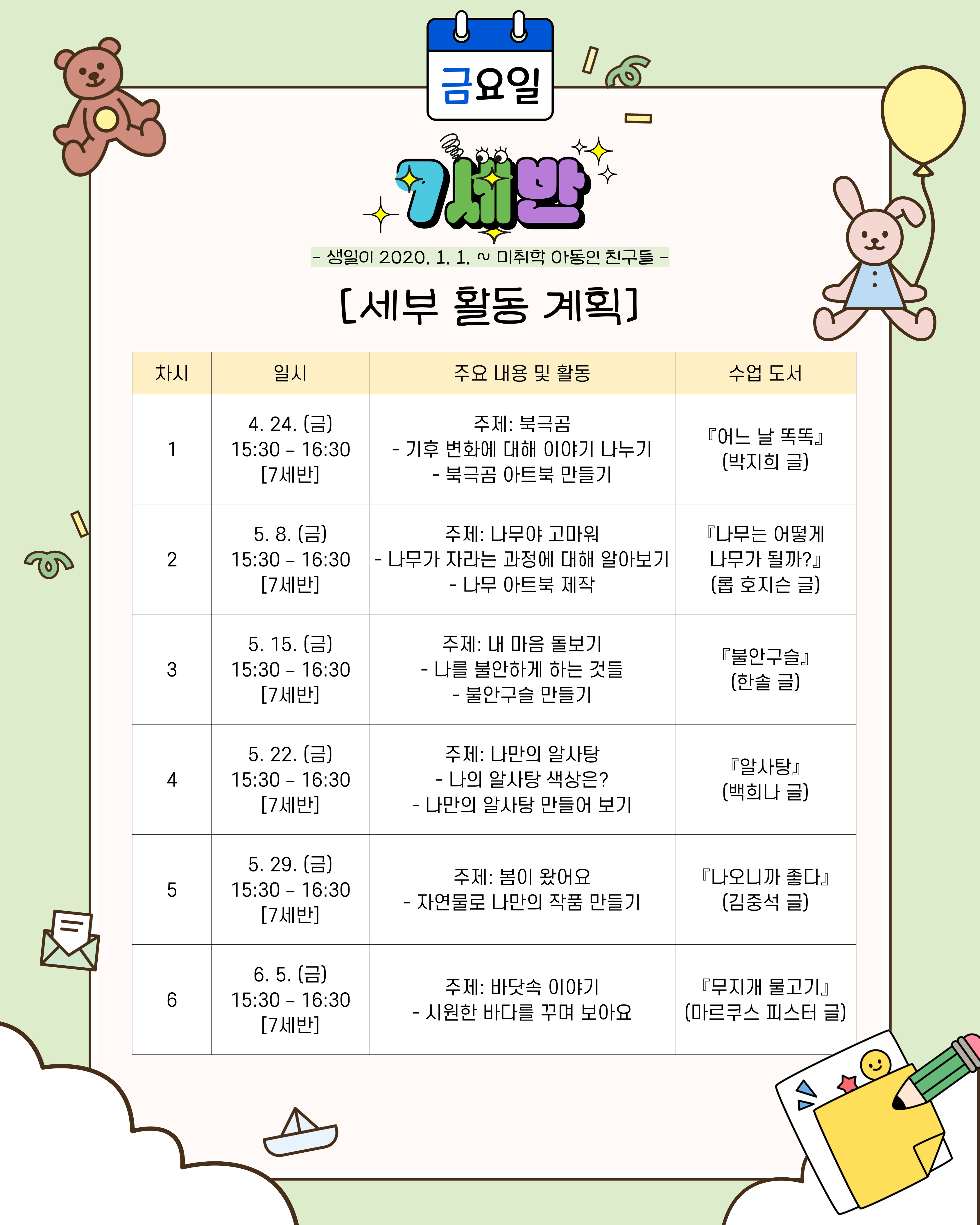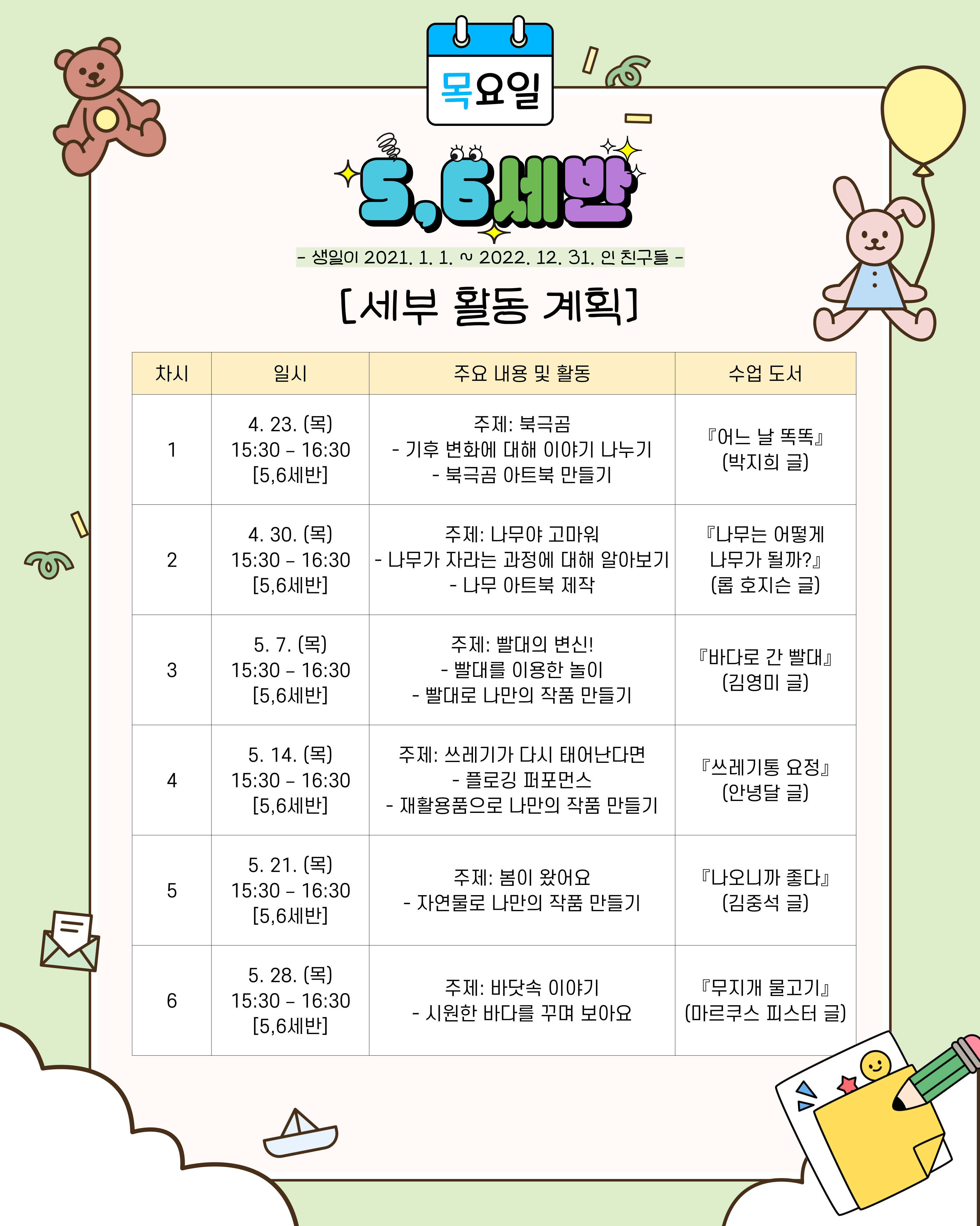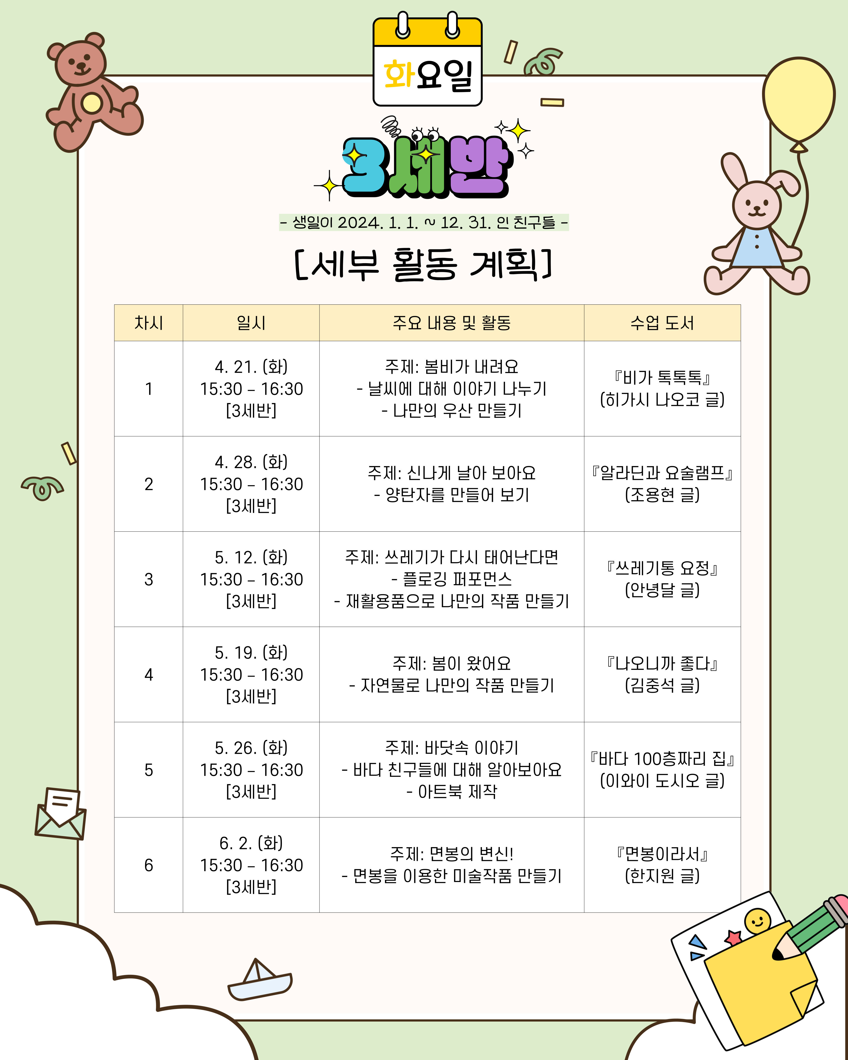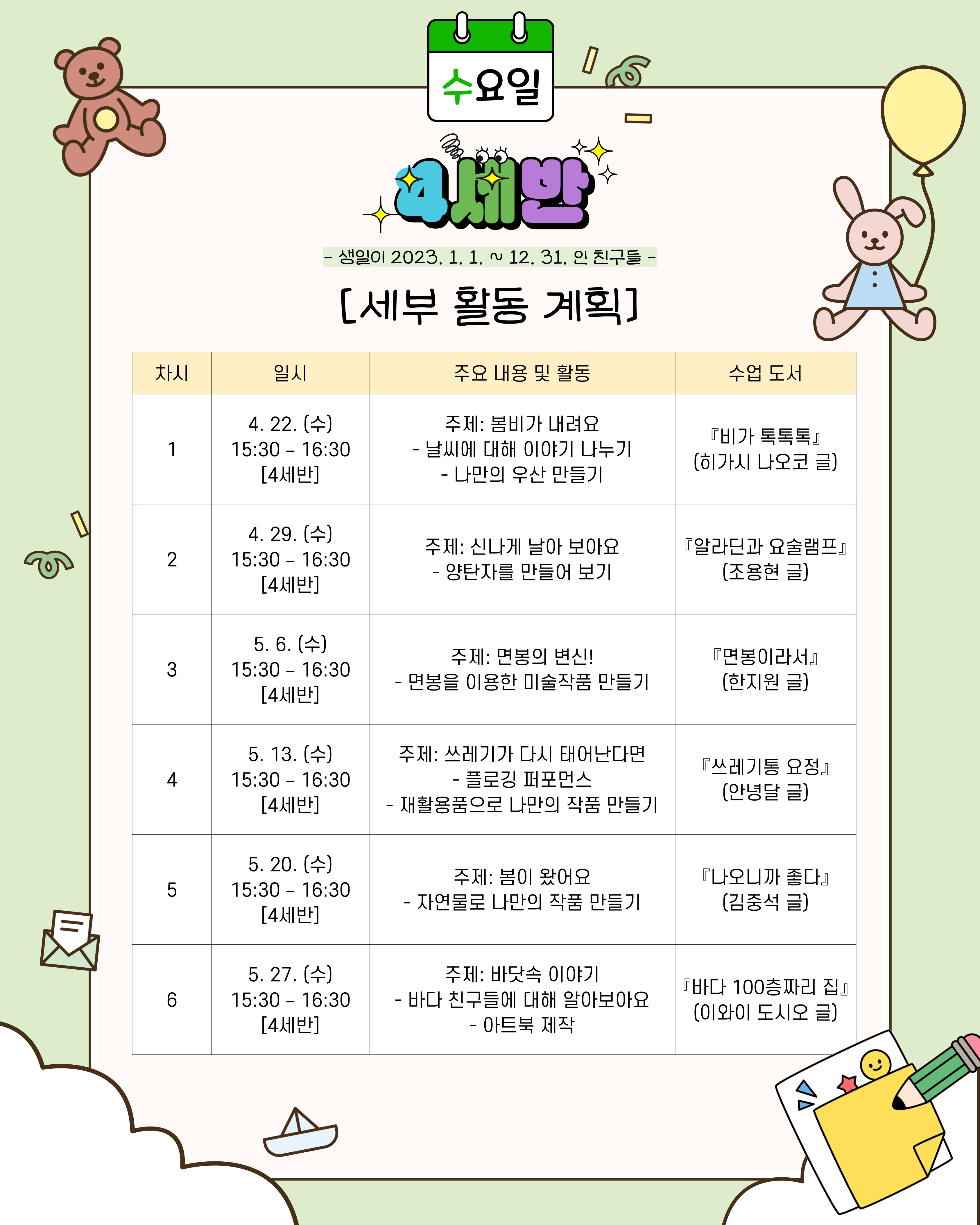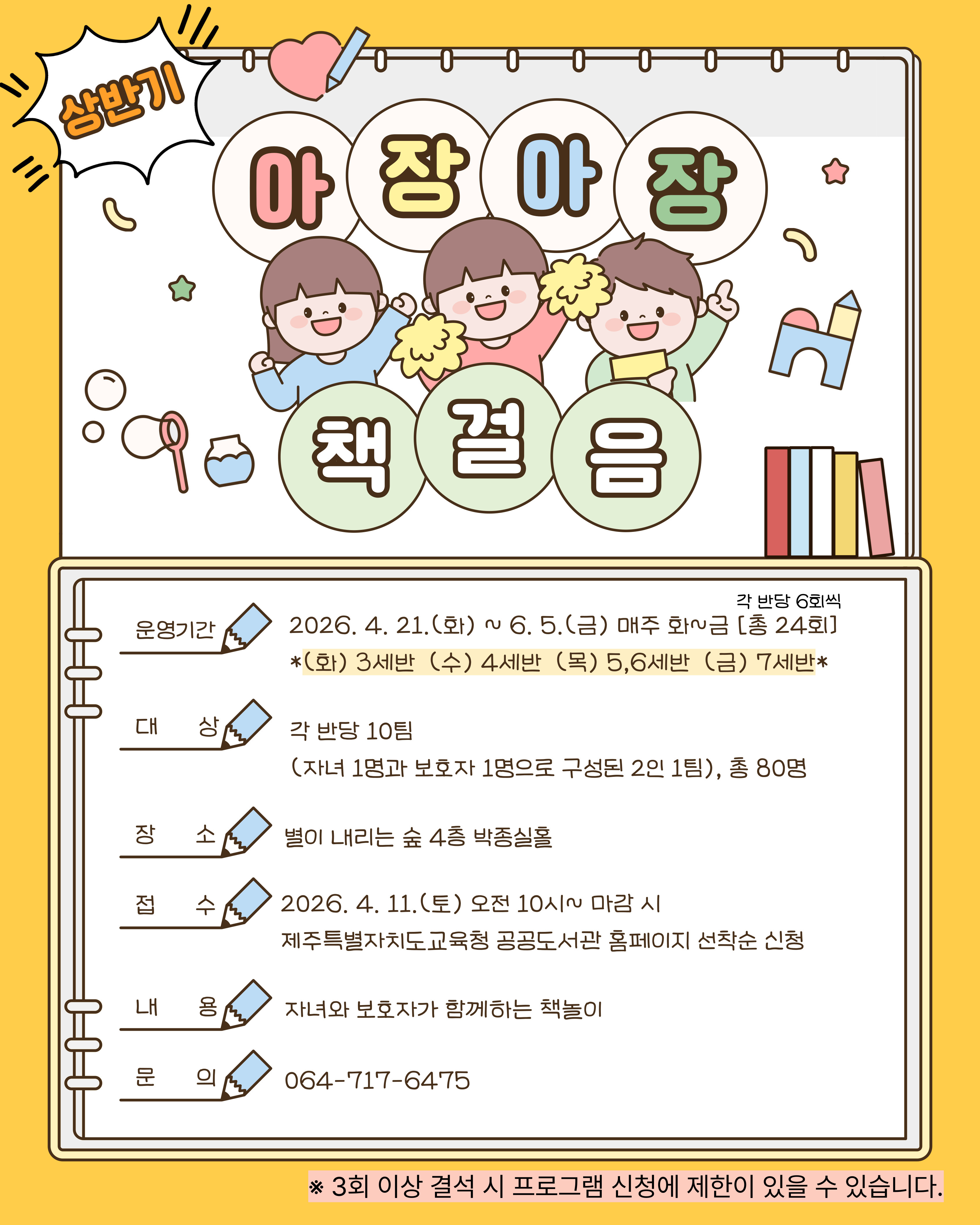 제주교육)제주도서관 영유아 대상 아장아장 책걸음 운영 작성자제주특별자치도교육청|작성시간09:13|조회수25 목록 댓글 0 글자크기 작게가 글자크기 크게가 제주도서관에서 3세~7세 이하 미취학 아동과 보호자를 대상으로 아장아장 책걸음 프로그램을 운영합니다!4월 11일 10시부터 신청이오니 확인하셔서 신청바랍니다!신청사이트 교육/강좌 > 교육/강좌 | 통합예약시스템교육/강좌 > 교육/강좌 | 통합예약시스템주소 : (63119) 제주특별자치도 제주시 문연로 5 Copyright © 2022 Jeju Special Self-Governing Provincial Office of Education. All rights reserved.org.jje.go.kr 다음검색 현재 게시글 추가 기능 열기 북마크 공유하기 신고 센터로 신고 댓글 댓글 0 댓글쓰기 답글쓰기 댓글 리스트