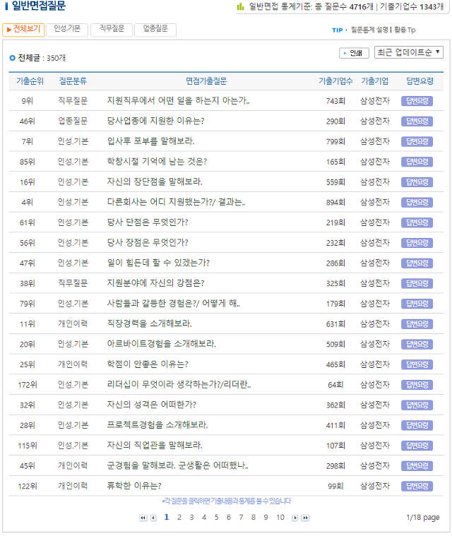 삼성전자 기출 면접질문과 후기·족보, 전형방식 등 실전 자료를 정리하고 통계화한 정보군요.