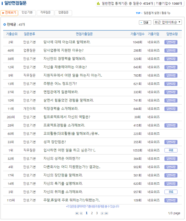 네오위즈 기출 면접질문과 후기·족보, 전형방식 등 실전 자료를 정리하고 통계화한 정보군요.