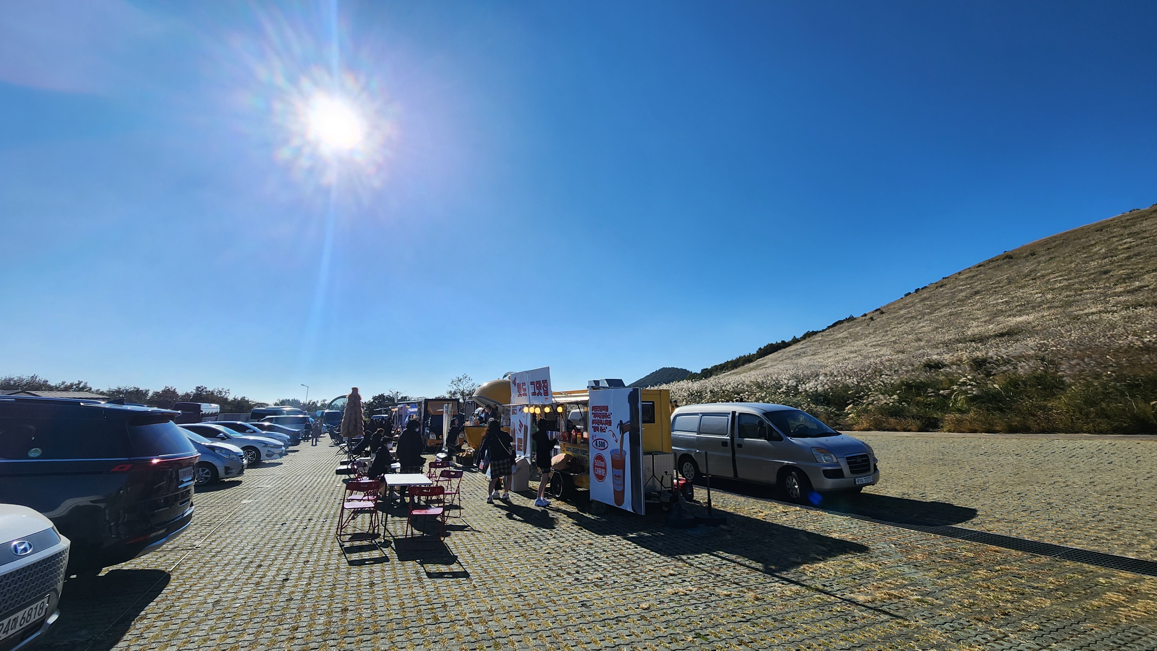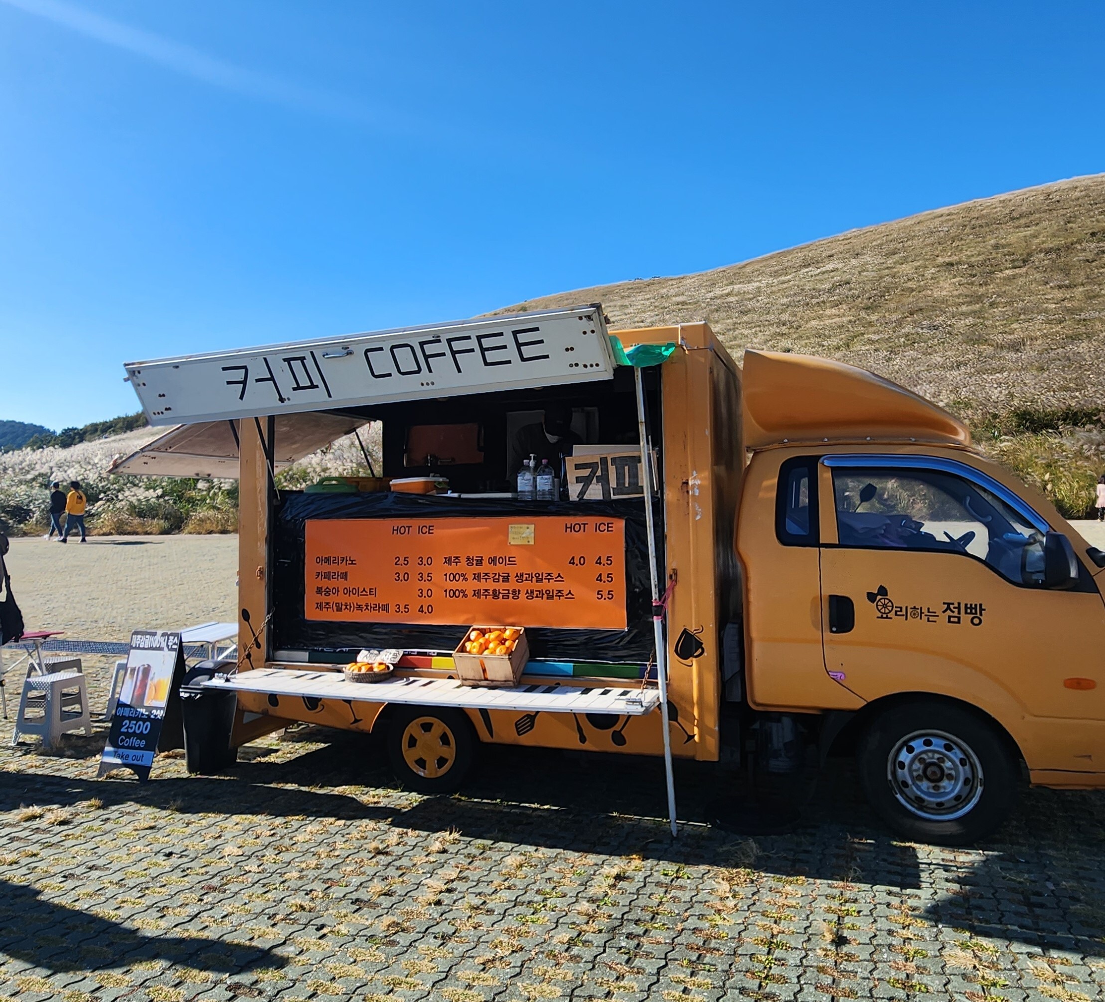 푸드트럭이 오름 아래에 자리잡아 커피, 음료, 핫도그등