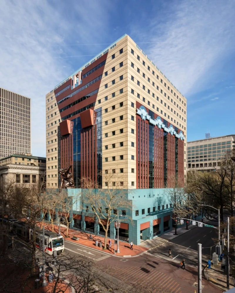마이클 그레이브스가 디자인한 포틀랜드 빌딩은 포스트모던 건축의 초석으로, 대담한 색상, 역사적 참고 자료, 장식으로 유명하다. 형태는 창문 그리드, 눈에 띄는 빨강, 파랑, 노랑 색상 및 쐐기돌과 기둥과 같은 대형 장식 요소가 있는 단순한 큐브 형태로 미니멀리스트가 선호하는 깔끔한 모서리 형태를 취한 그레이브스는 색상과 색다른 장식 사용으로 모더니즘을 해체시켰다.